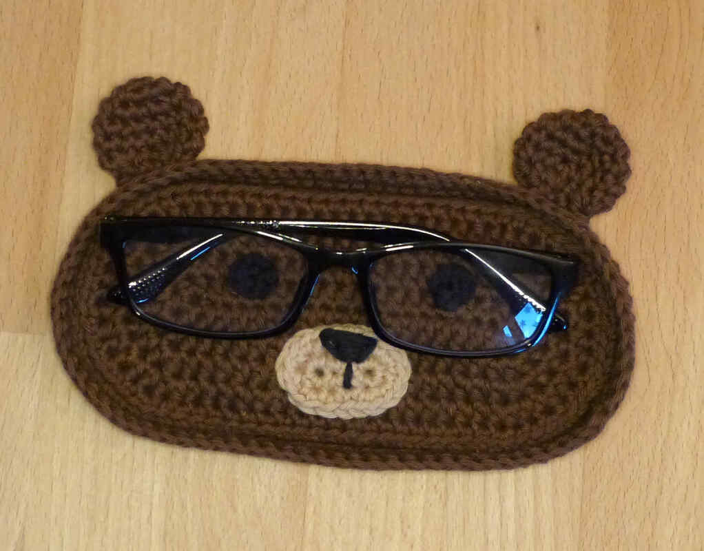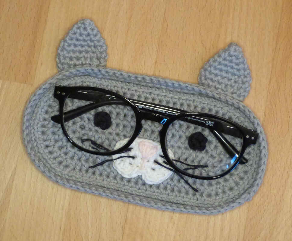 Bei Verwendung von Baumwollgarn mit einer Lauflänge von ca. 85m/50g und Nadelstärke 3,5 wird die Schale 16 cm lang und 8 cm breit und passt für viele handelsübliche Brillen.