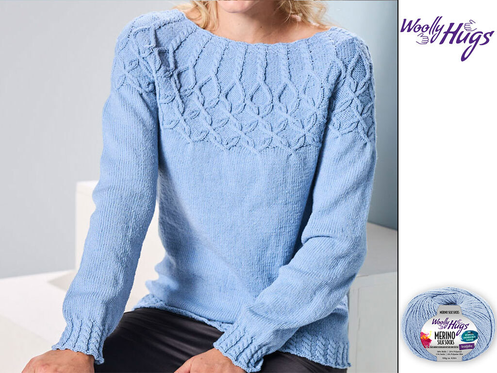 Zieh diesen zarten Himmelblau-Pulli über – und spür sofort sanfte Leichtigkeit. Das edle Garn von Woolly Hugs schimmert wunderbar weich, während das filigrane Blattmuster am Ausschnitt wie ein Hauch Frühling wirkt. Lässiger Boot-Neck, lange Ärmel mit zarter Rippe – purer Wohlfühl-Luxus.