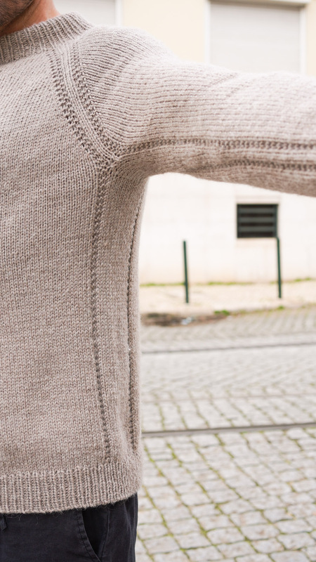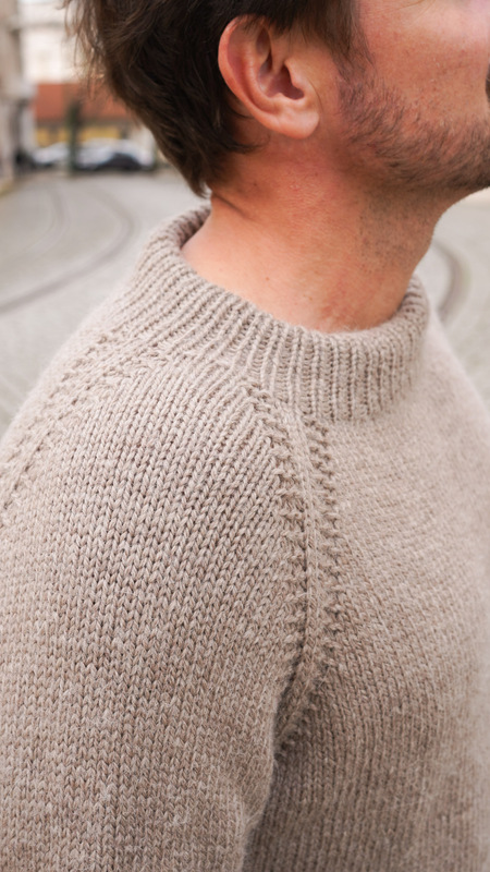 Der Pullover wird nahtlos von oben nach unten gestrickt. Die Passe entsteht durch gleichmäßige Raglan-Zunahmen. Besonders ins Auge fallen die markanten Raglanlinien, die wie eingefasste Streifen wirken und harmonisch in Rumpf und Ärmel übergehen. Sie verleihen dem schlichten Design eine moderne, strukturierte Optik.
