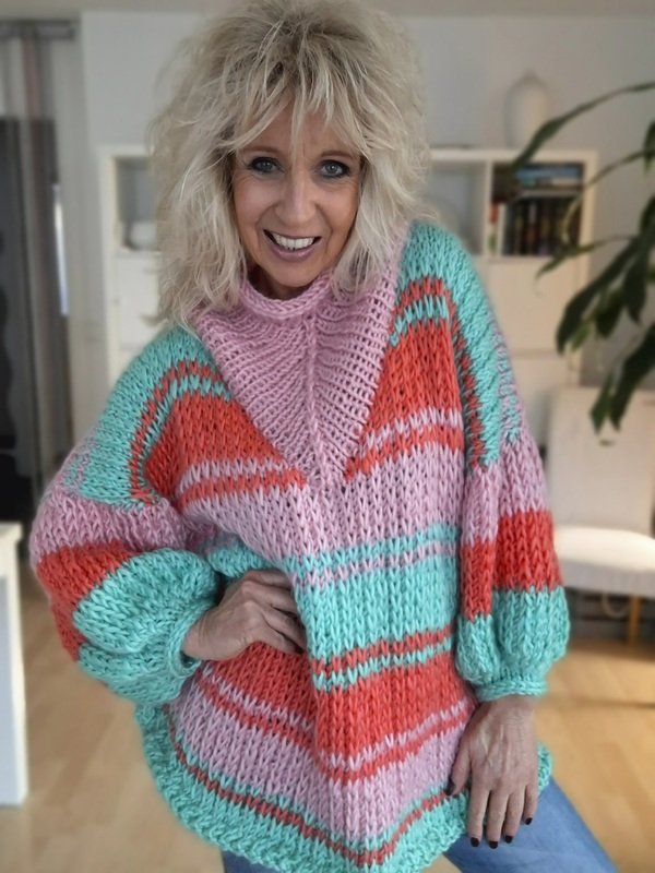 Der tiefe V-Ansatz, der optisch gerollte Kragenrand, grobes Maschenbild und fast ballonartige Ärmel machen den Pullover außergewöhnlich und topmodisch.