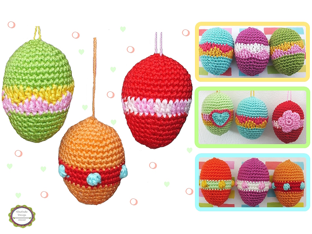 Diese Anleitung enthält neben den Ostereiern mit drei verschiedenen Mustern auch ein Blümchen und Mini-Herz als Applikationen zum zusätzlichen Verschönern der Eier.