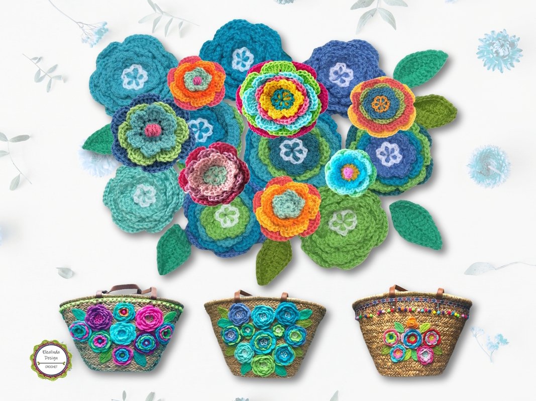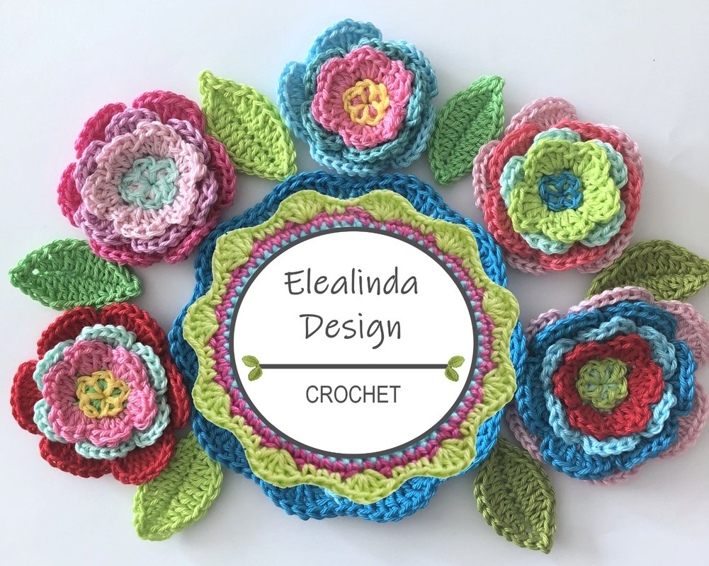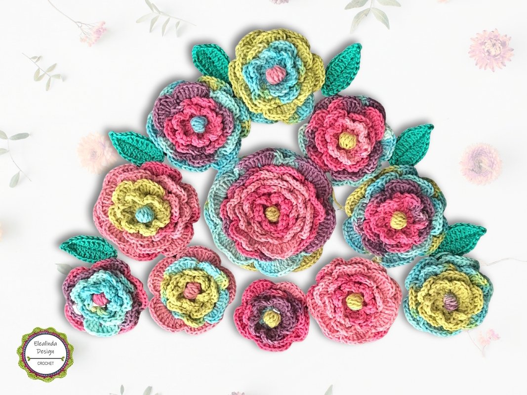 Häkelanleitung für wundervolle mehrlagige Häkelblumen mit 3-D-Effekt. Mit diesen Blumen in 3-D-Optik lassen sich vielerlei Projekte verzieren. Die Anleitung umfasst einfarbige und mehrfarbige Blumen (leicht abweichende Herstellung), 2 unterschiedliche Verzierungen für die Blütenmitte sowie begleitende Pflanzenblätter.