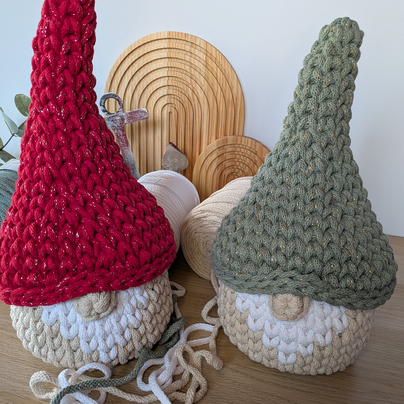 Garn: 5 mm Baumwollgarn (z. B. von Bobbiny, Kokonki, Woodycrafts oder ähnlich) in Beige, Weiß und einer Mützenfarbe deiner Wahl. (Meine Mützen im Bild sind Weihnachtsrot und Salbeigrün mit Goldfaden von Woodycrafts)