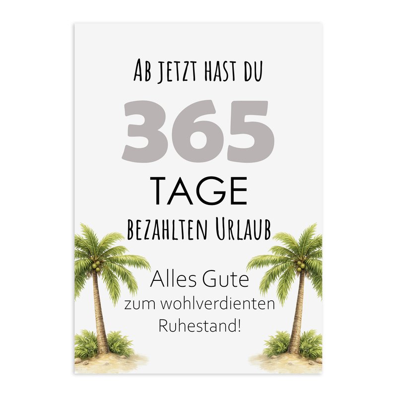 Auf dem Poster steht: „Ab jetzt hast du 365 Tage bezahlten Urlaub“ – ein humorvoller Hingucker und ein liebevolles Andenken zum Rentenstart.