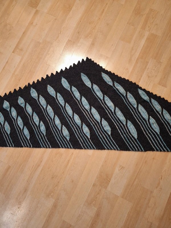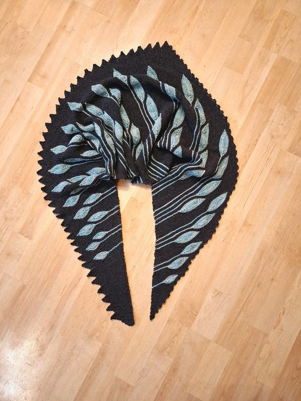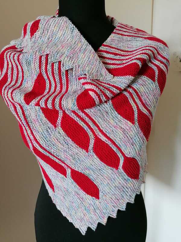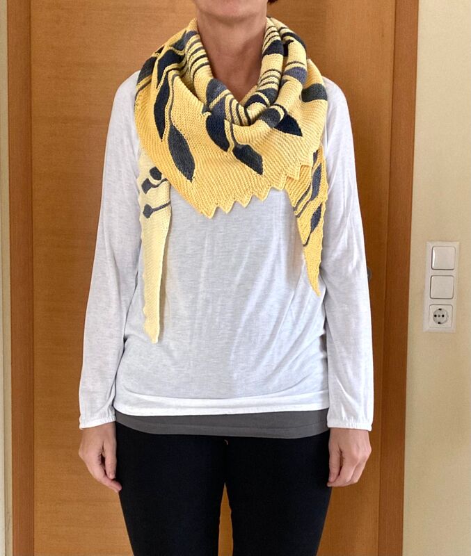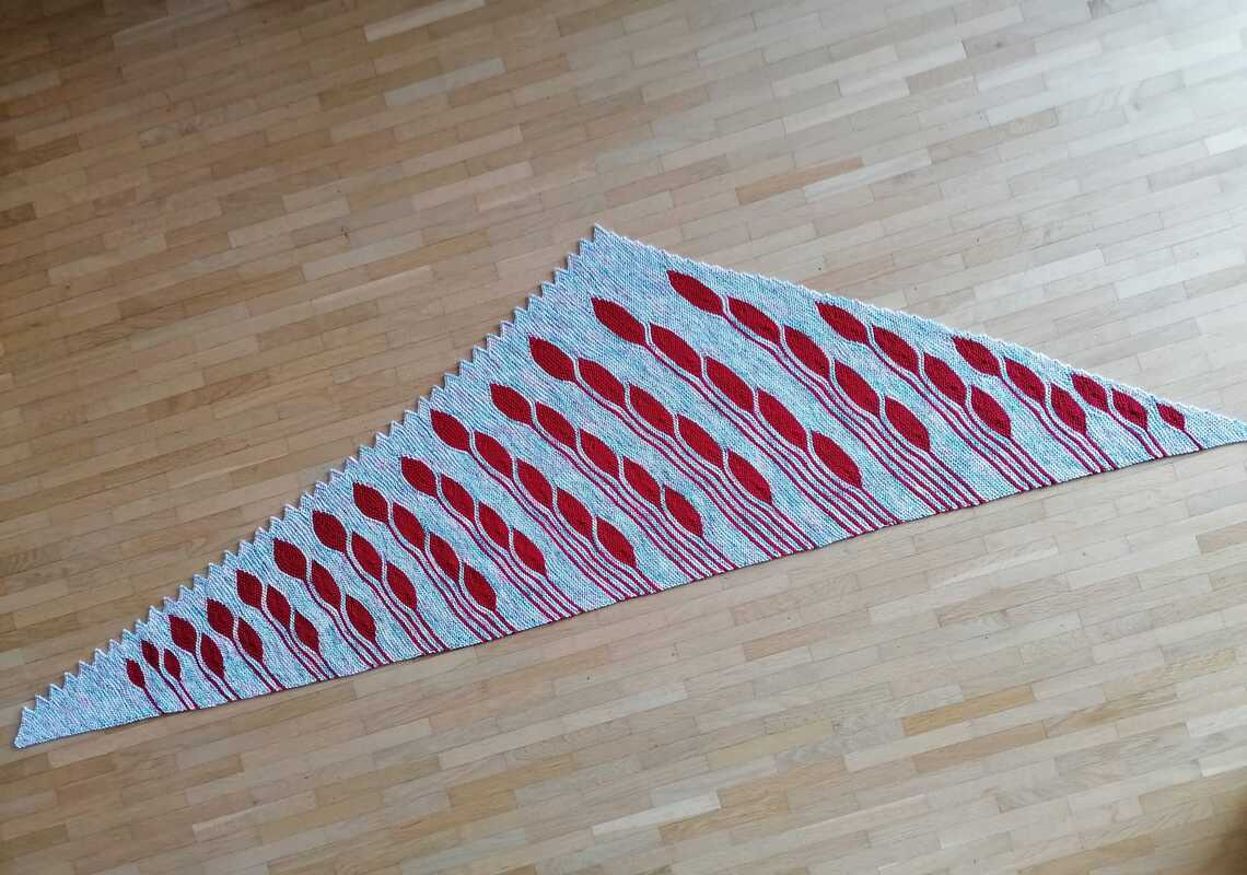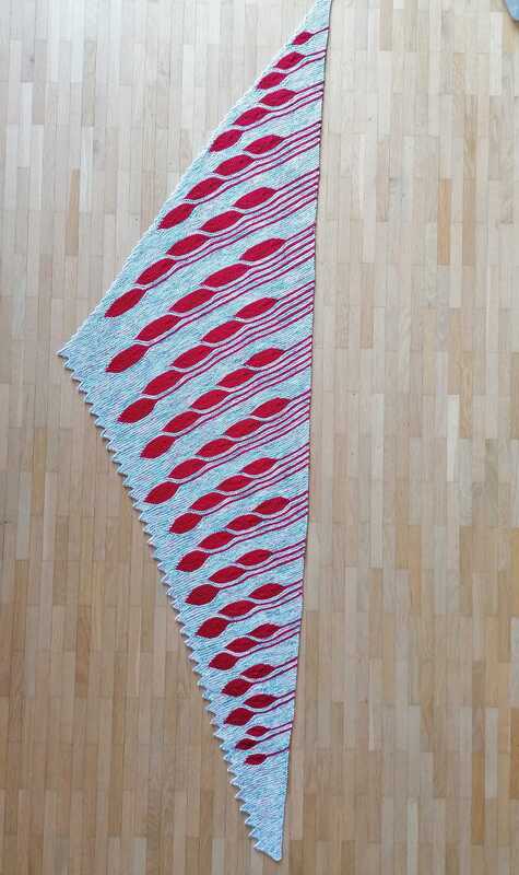 Es ist ein asymmetrisches flaches Dreieckstuch mit vielen verkürzten Reihen.