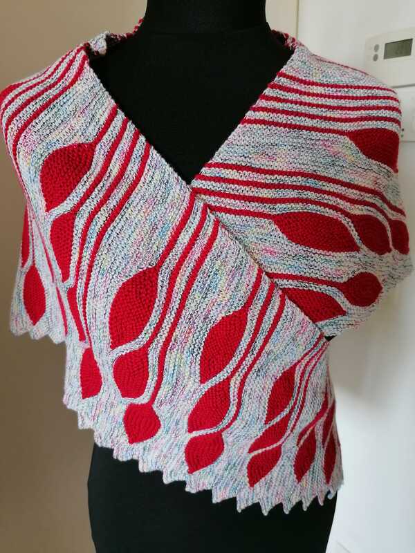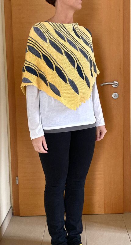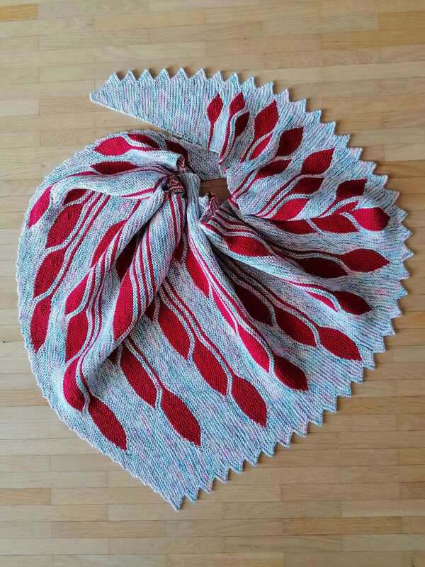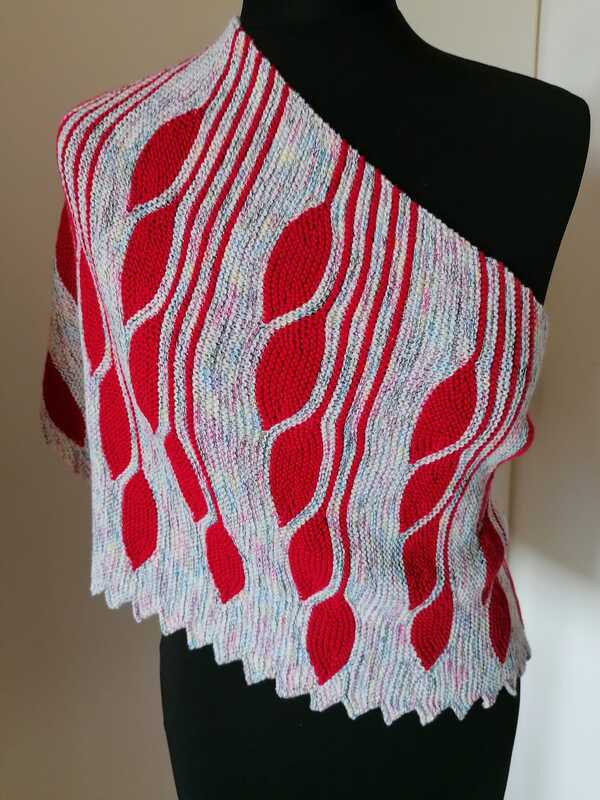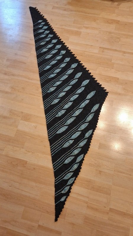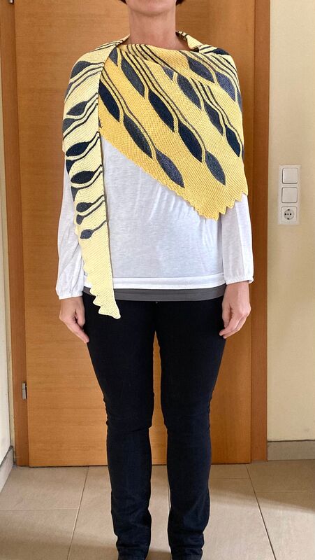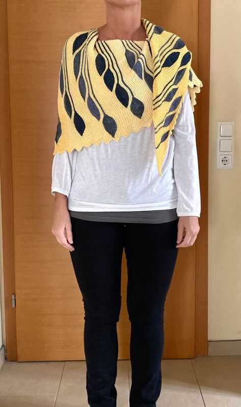 Es ist ein asymmetrisches flaches Dreieckstuch mit vielen verkürzten Reihen.