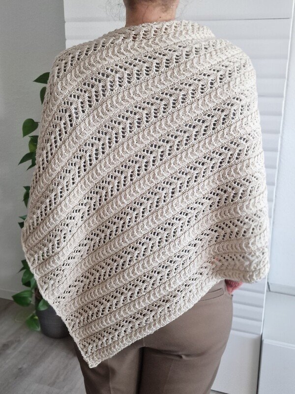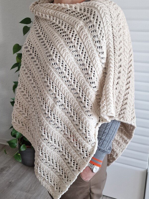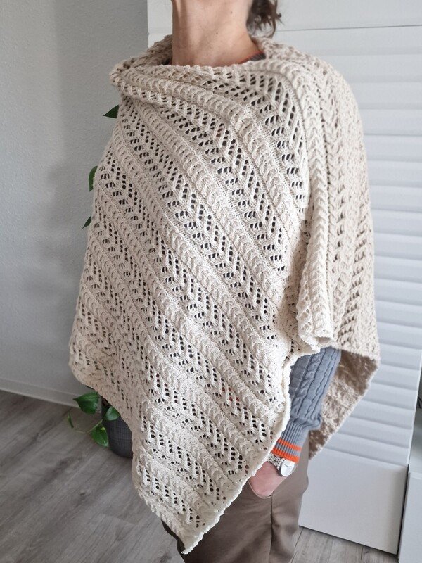Der Poncho wird in einem Stück, wie ein extrem breiter Schal gestrickt und dann nur noch auf einer Seite zusammengenäht. Das Muster besteht aus einem Zopf, der sich mit einem Ajourmuster abwechselt. Wirkungsvoll und trotzdem nicht kompliziert.