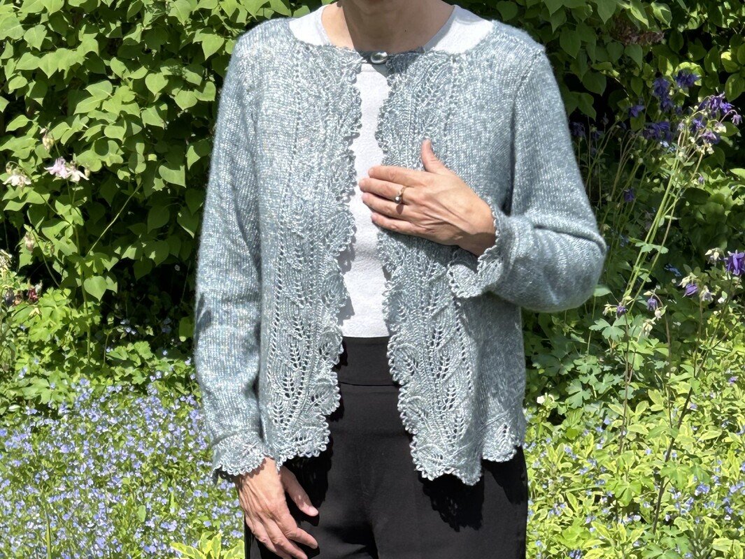 Ein wunderschönes Blattmuster rankt sich um diese filigrane Strickjacke. Sie wird am Halsausschnitt mit einem einzigen Schmuckknopf geschlossen.