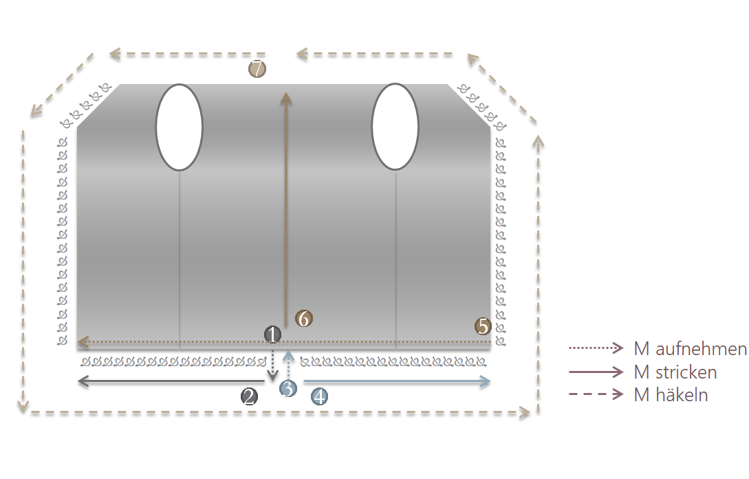 Die Anleitung ist in Größe S vollständig beschrieben (Höhe 48 cm / Breite 42 cm). Sie enthält Tipps, um die Länge und Größe individuell anzupassen.
