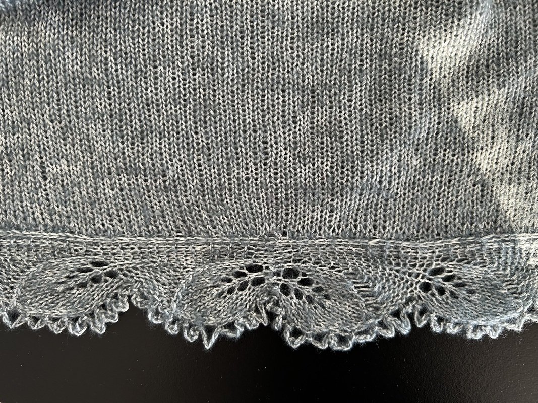 Dieses einzigartige Stück wird unkonventionell gestrickt. Sowohl bei den Ärmeln als auch bei Vorder- und Rückenteil wird jeweils mit einer Spitzenborte begonnen. Die Maschen für die Arbeit werden anschliessend quer aus dem seitlichen Rand der Borte aufgenommen. Am Schluss wird das ganze mit einer zusätzlichen Bogenabschluss aus Luftmaschen verfeinert.
