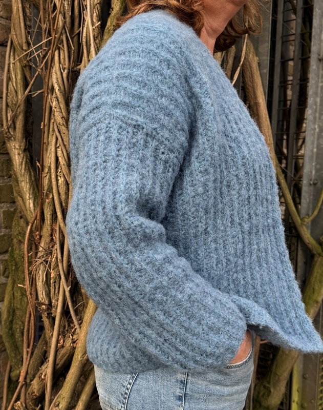 Pila ist ein federleichter, kuscheliger Cardigan im modernen Halbpatentmuster – gestrickt von oben nach unten, fast ganz ohne Nähte. Nur die Ärmel werden am Ende zusammengenäht.