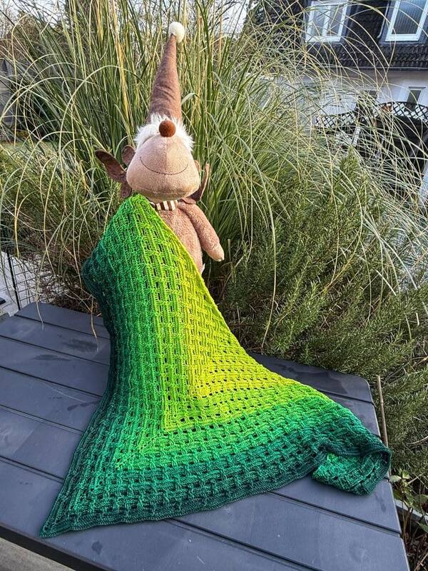 Das Tuch kann in jeder beliebigen Größe gehäkelt werden, da sich die Reihen wiederholen. Bitte beachte, wenn du eine andere Wolle verwendest, eine andere Nadelstärke, oder generelle lockerer/fester häkelst, kann die Größe variieren.