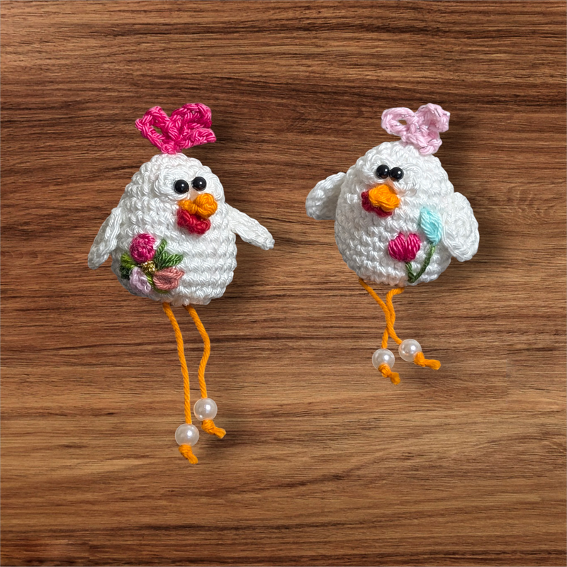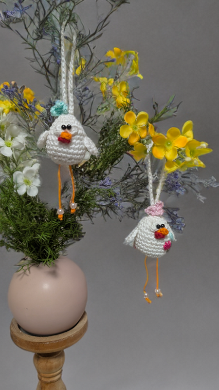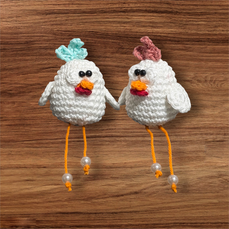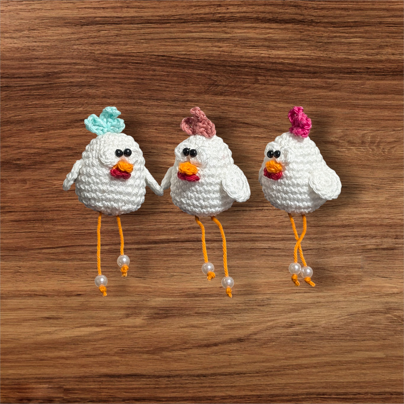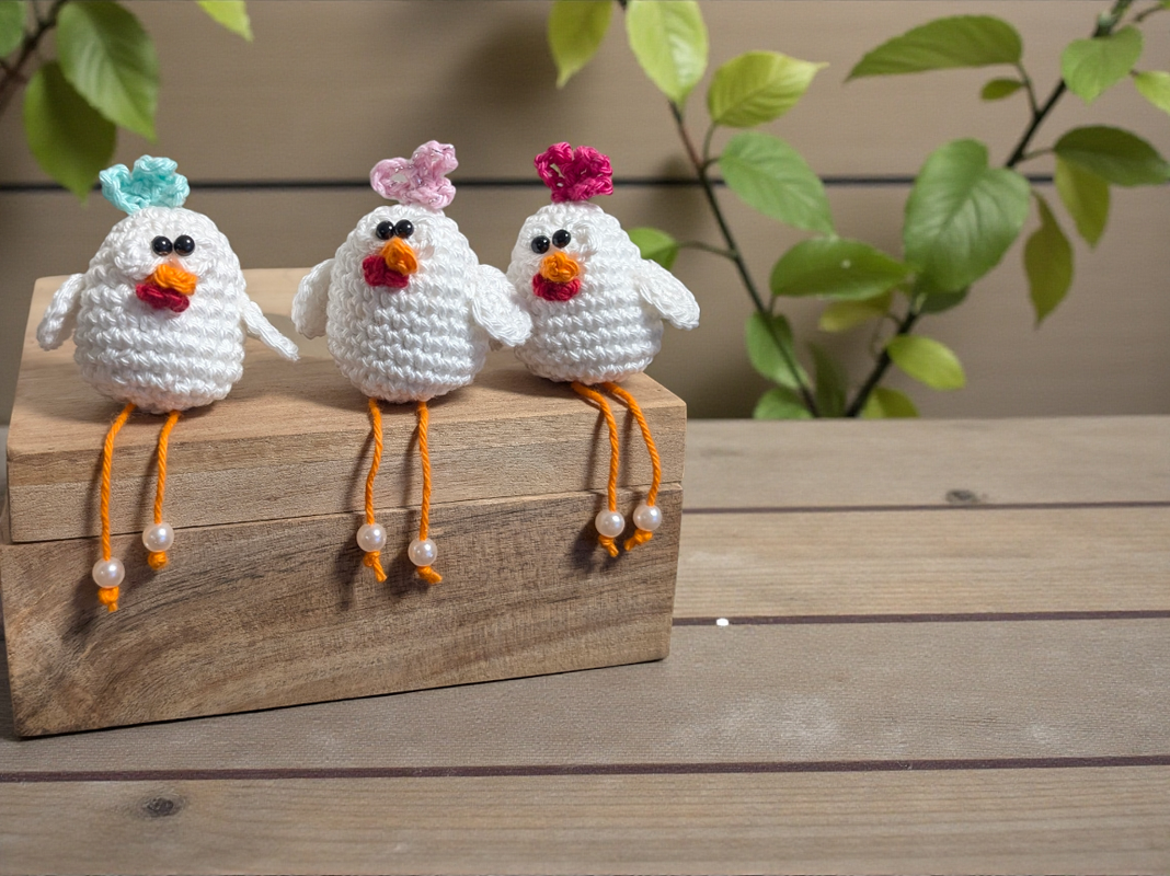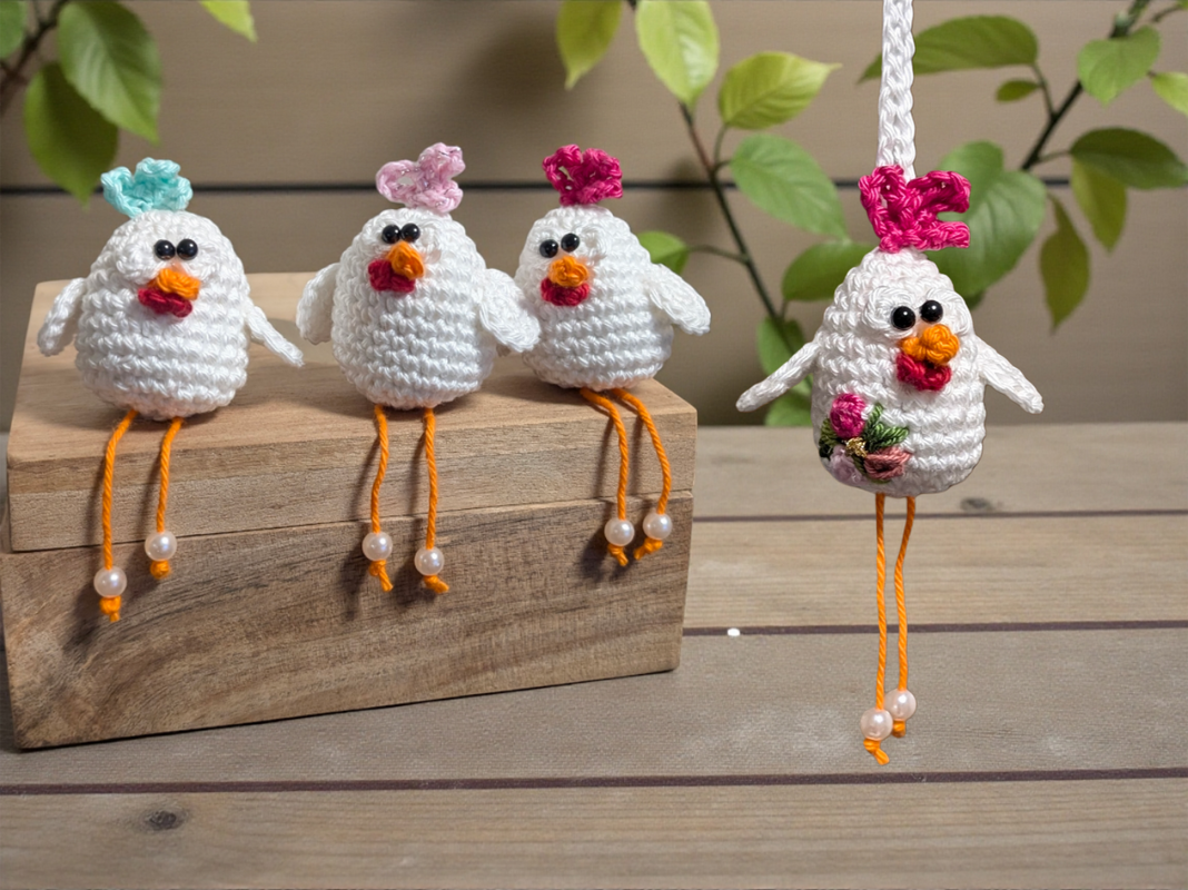 Mit dieser liebevoll gestalteten Häkelanleitung zauberst du niedliche kleine Hühner, die garantiert für gute Laune sorgen. Die Hühner können vielseitig verwendet werden – ob als Kantenhocker auf Regalen, Blumentöpfen oder Schränken oder als Anhänger zur Dekoration, z. B. an Zweigen, Geschenken oder im Fenster.