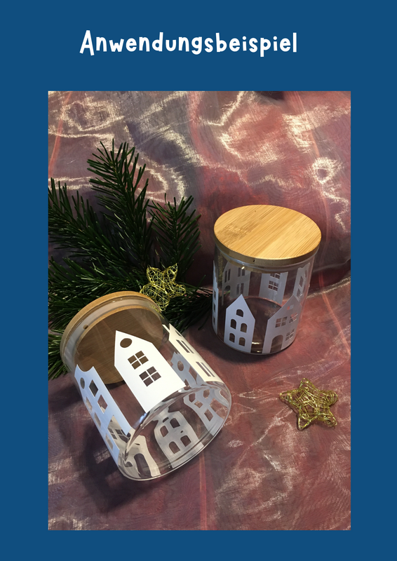 Zur Fensterdekoration eignet sich u.a. auch statische Folie. Zum Bekleben von Gegenständen empfehle ich Vinyfolie, aber auch aus Papier lassen sich schöne Dekorationen erzeugen.