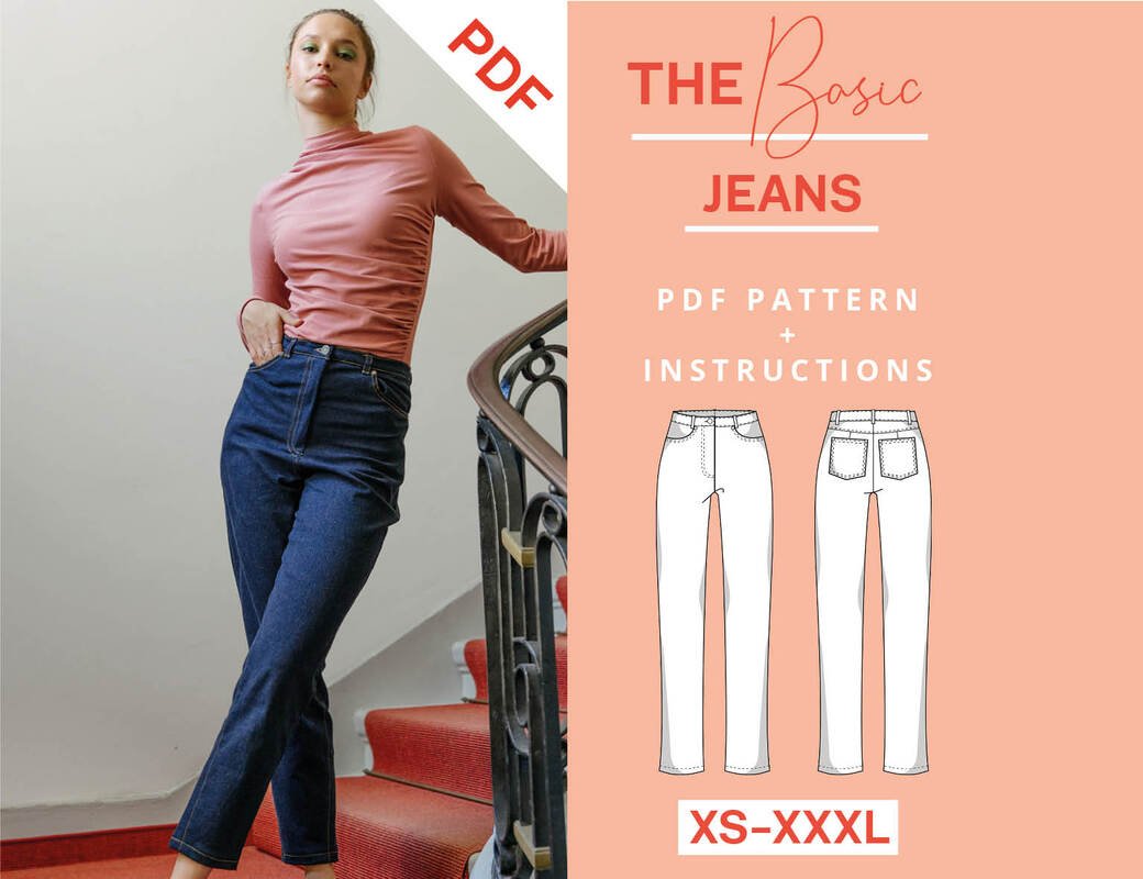 Jeans Schnittmuster zum Nähen. Mit dem Basic Jeans Schnittmuster für Damen kannst du dir eine Jeanshose mit geradem Bein nähen.
