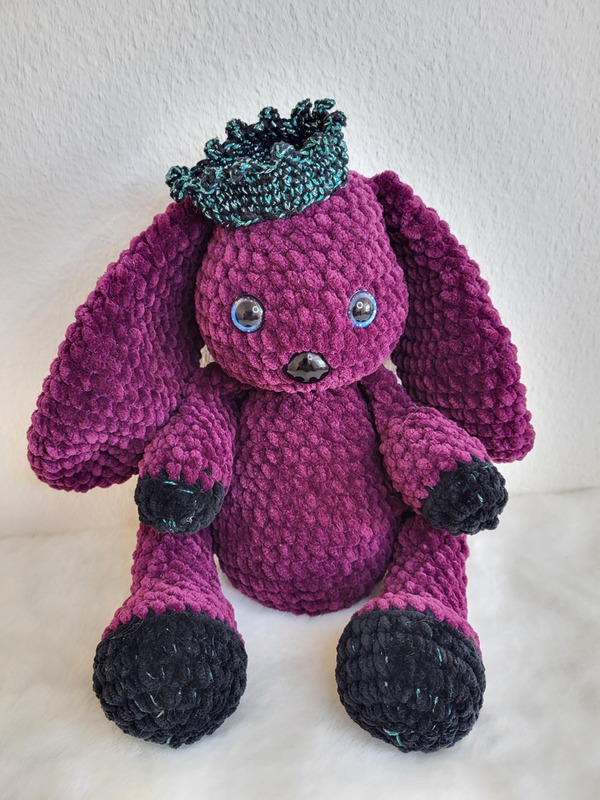 Du kannst die Hasen-Prinzessin sowohl mit Chenille-Garn oder auch mit Baumwollgarn häkeln. Bitte pass entsprechend deiner Garnwahl deine Häkelnadelstärke sowie die Grösse der Sicherheitsaugen an.