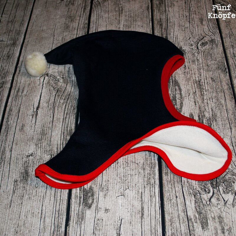 Unten geht die Mütze weiter als übliche Mützen vorn und hinten herunter – dies hat den Zweck, auch den Hals noch mit zu wärmen.