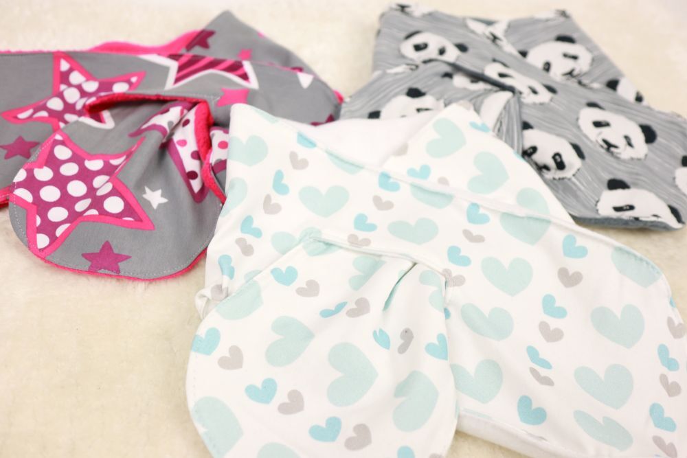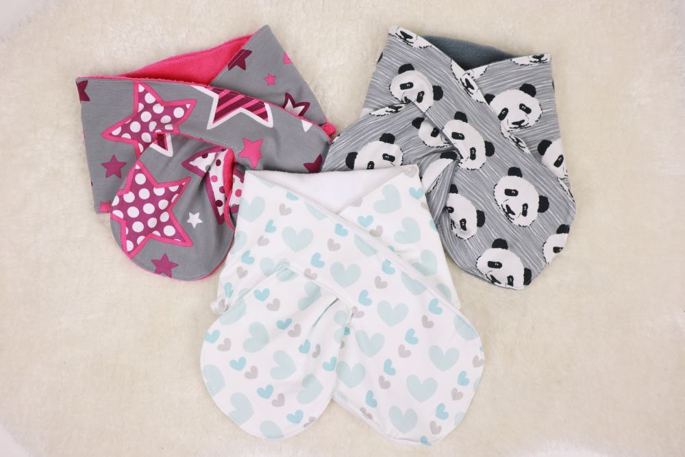 Holly kann aus eigentlich allen bequem zu tragenden Stoffen genäht werden – ich empfehle, für mindestens eine Seite einen kuscheligen, warmen Stoff zu wählen, z.B. Fleece, Plüsch, … . Selbstverständlich funktionieren auch 2 Lagen Jersey – nur mit Kälteschutz ist es dann eher weniger was. Für meine Beispiele habe ich hier jeweils eine Lage Fleece und eine Lage Jersey verwendet.