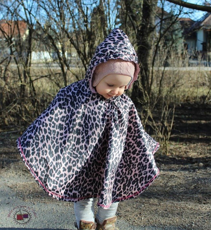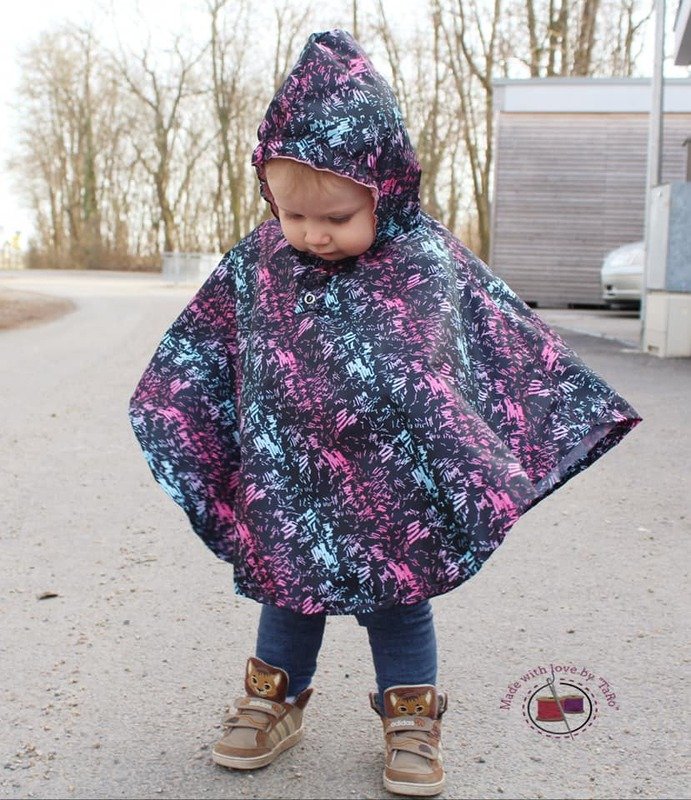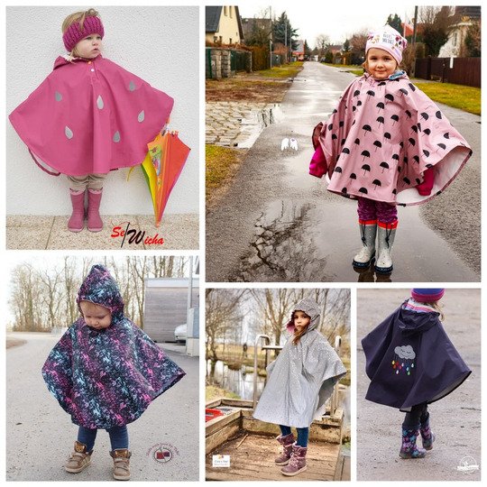 Und das kann uns ab sofort total freuen, denn: der Regentanz ist da! Ein Regenponcho / Cape, welches du von Gr. 74 – 164 jeweils in Einzelgrößen aus Regenjackenstoff nähen kannst. Die Kapuze wird mit Jersey oder Sweatstoff gefüttert, und damit sie schön anliegt, ist vorn ein Gummizugband verarbeitet.