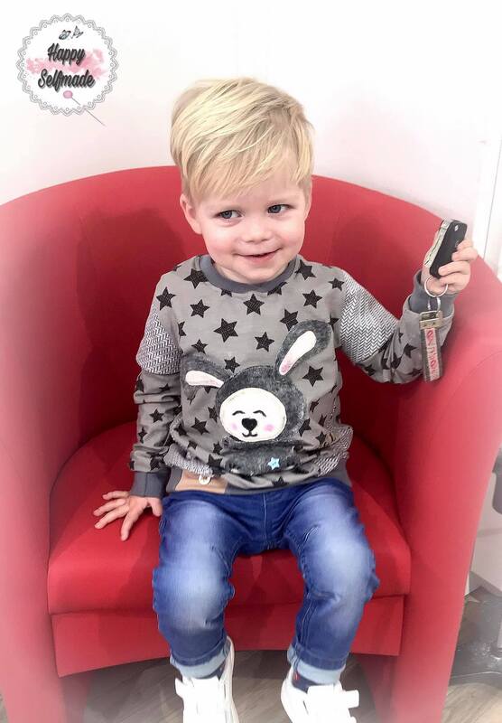 Gr. 86 – 152 deckt das Schnittmuster ab – und dies an den Ärmeln in Einzelgrößen, am Vorder- und Rückenteil in Doppelgrößen. Als Hingucker befindet sich auf dem Schnittmuster vorn eine schräge Unterteilung, die du nähen kannst – aber nicht musst. Wenn du den Schnitt unterteilst, kannst du dir die Seite für den Streifen aussuchen – oder du unterteilst gleich links und rechts.