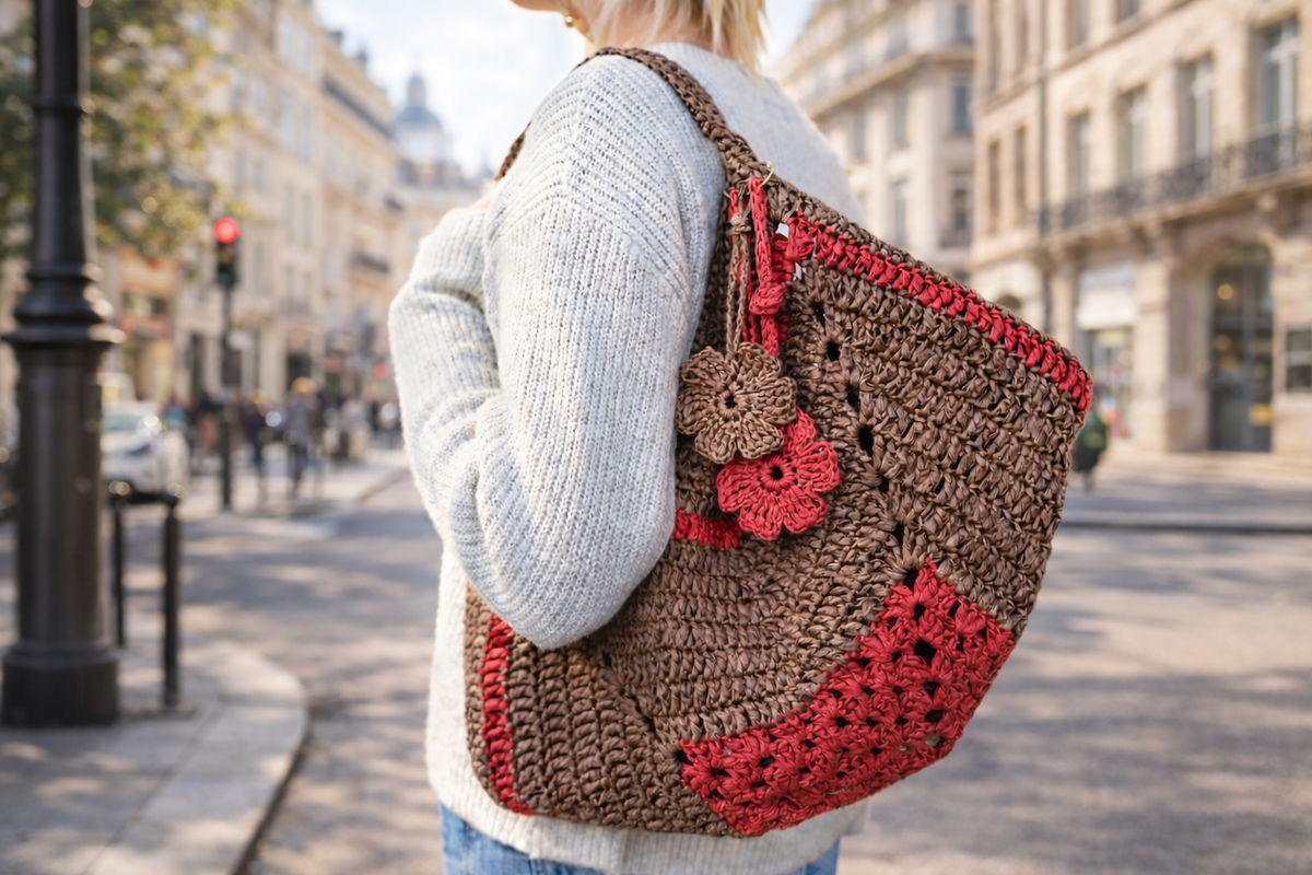 Mit dieser Anleitung können Sie eine schöne, leichte Sommerhandtasche aus Raffia häkeln. Im Set enthalten sind die Häkelanleitung für die Tasche sowie die Häkelanleitung für einen blumenförmigen Anhänger.