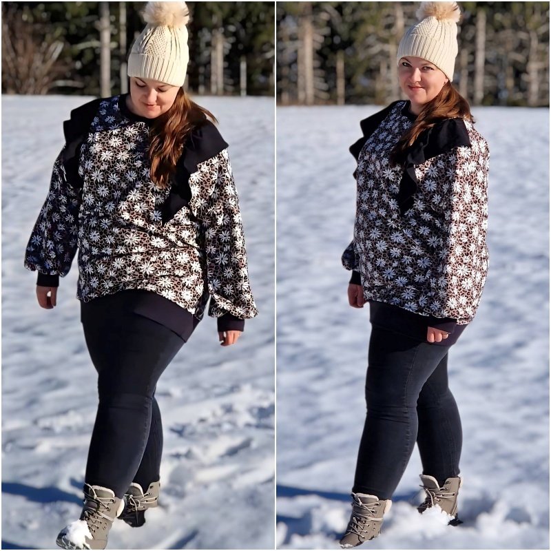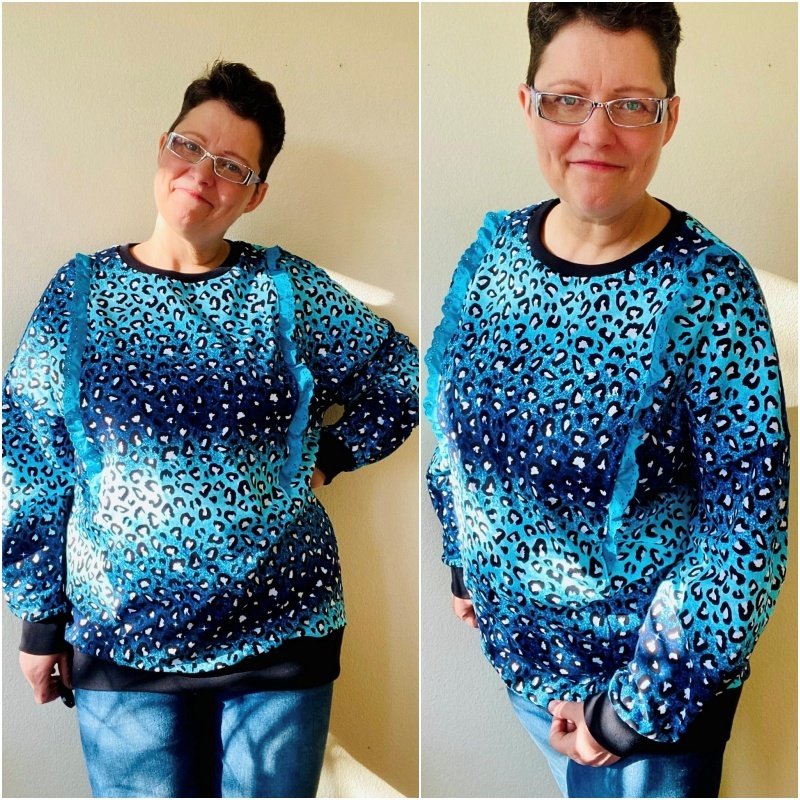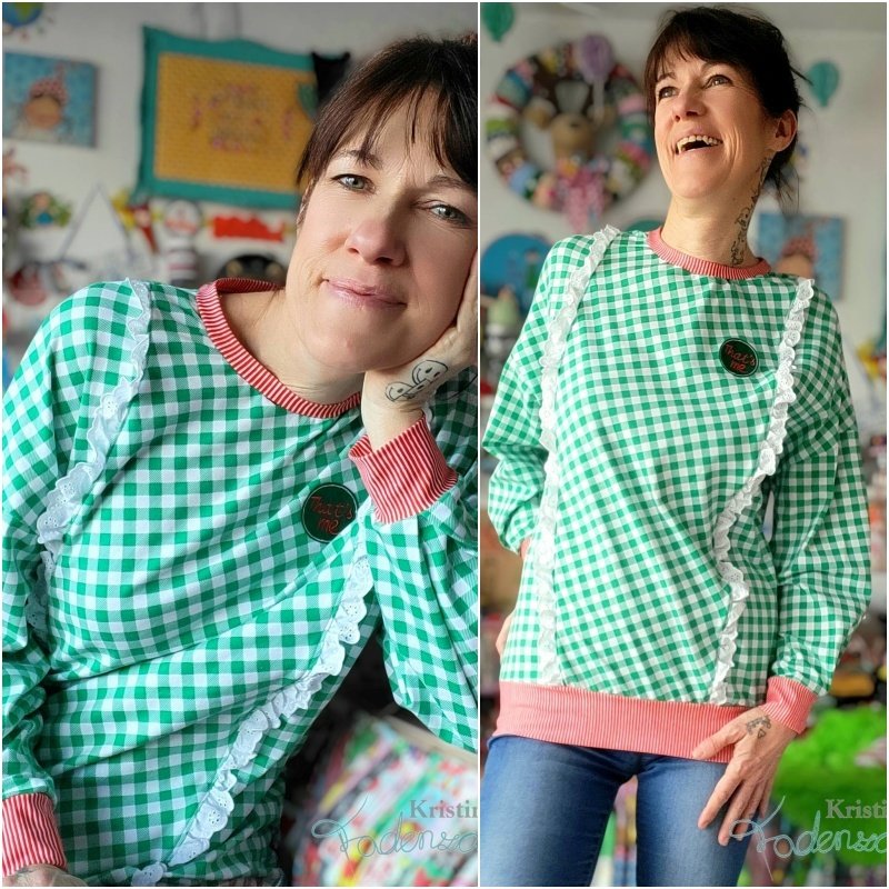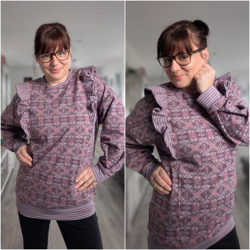 Bubblegum ist gemacht zum Wohlfühlen. Ein Sweater, der uns im Alltag begleitet, übergeworfen werden kann wenn es bequem sein soll und trotzdem - es gibt so tolle Highlights beim Schnittmuster, dass aus jedem Werk etwas Besonderes wird. Das lockere, bzw. leicht taillierte (es gibt zwei Linien) geschnittene Schnittmuster mit seinen überschnittenen Schultern verfügt über eine legere, angenehme und lässige Passform und wird mit Bündchen an allen Abschlüssen genäht. Der Halsausschnitt ist ein Rundhalsausschnitt, der ebenfalls mit einem angenehmen Bündchen genäht wird. Die Highlights des Schnittes beginnen bei den optionalen Teilungen. So sind nicht nur totale Basicvarianten möglich, sondern mit zwei Teilungen auf Front- und Rückseite kann richtig viel angestellt werden. Hier können verspielte Rüschen in verschiedenen Varianten entweder nur auf der Front oder über Front- und Rückseite angebracht werden. Es gibt eine kurze Rüschenversion und eine lange Rüschenversion. Ergänzt werden diese tollen Möglichkeiten durch vier verschiedene Ärmel - eine kurze Ärmelversion, eine normale, lange Ärmelversion, ein am Abschluss geraffter Ärmel oder ein Ärmel mit Kellerfalte am Abschluss.
