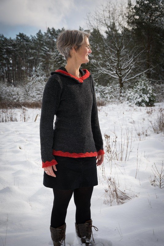 Der Pullover ist mäßig schwer zu stricken. Du solltest schon etwas Erfahrung im Stricken haben und neben rechten und linken Maschen auch Zunehmen, Abnehmen und Abketten beherrschen. Das zweifarbige Muster ist relativ einfach und eignet sich gut für eine erste Arbeit im mehrfarbigen Stricken.