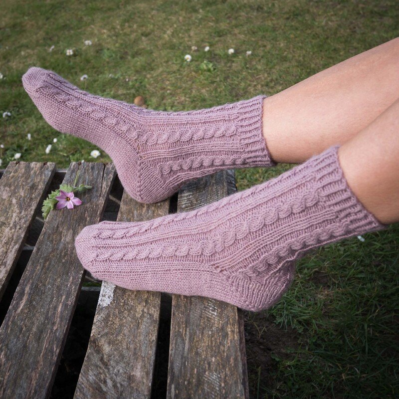 Stilvolle Socken mit Zopf- und Streifenmuster auf dem Schaft und den Fußoberseiten. Die Socken werden vom Bündchen abwärts gestrickt und haben eine Bumerangferse.