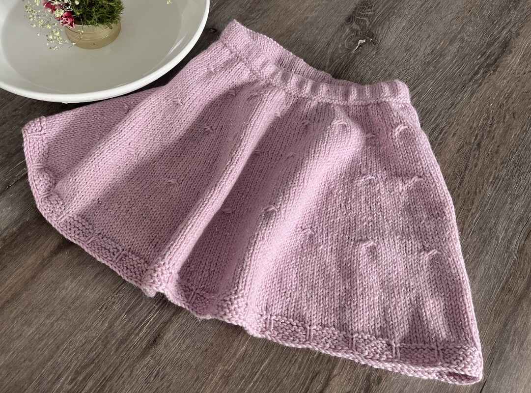 Diese Strickanleitung beschreibt einen zeitlos schönen Mädchenrock in A-Linie, gestrickt aus leichter Merinowolle, veredelt mit einem feinen Silbergarn für einen dezenten, eleganten Schimmer.