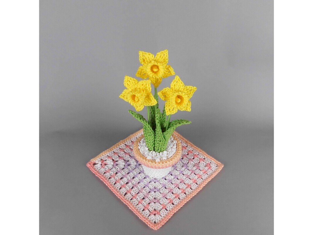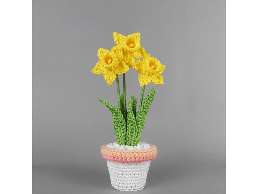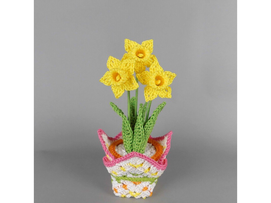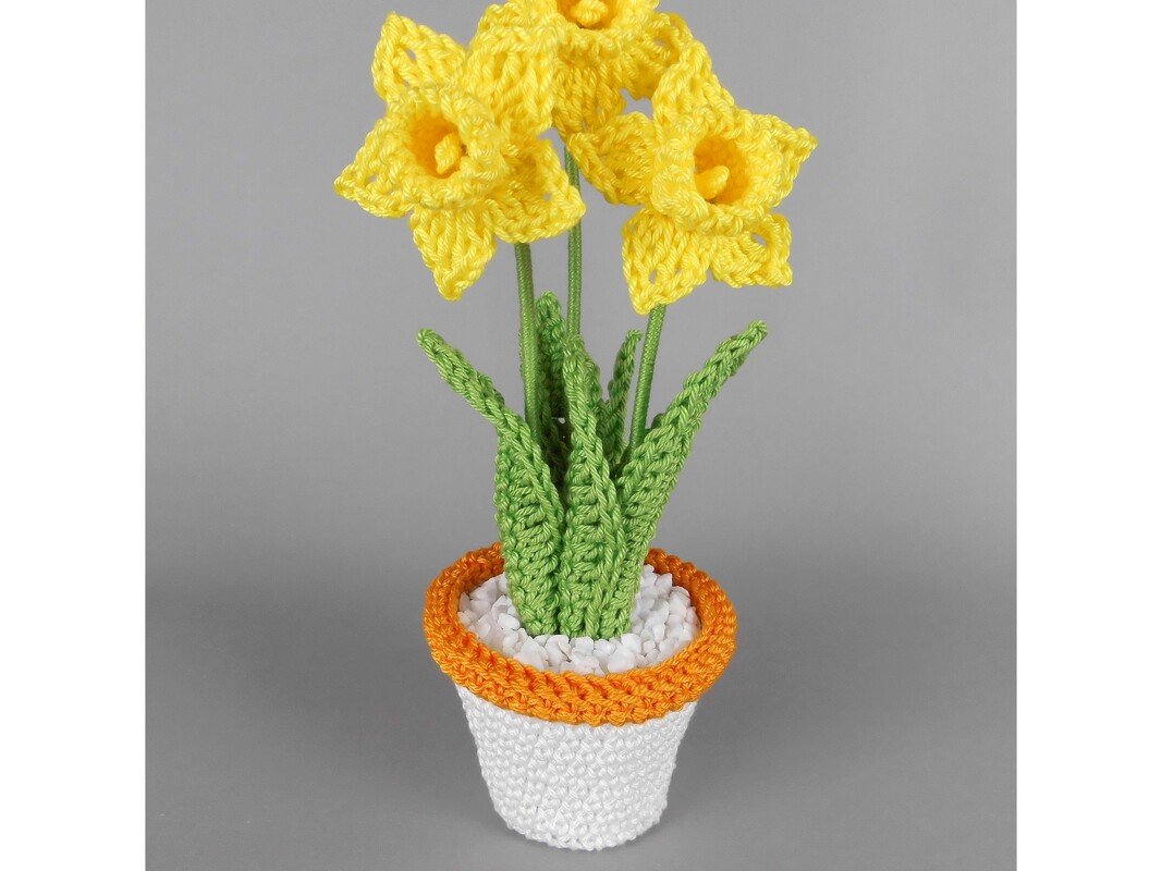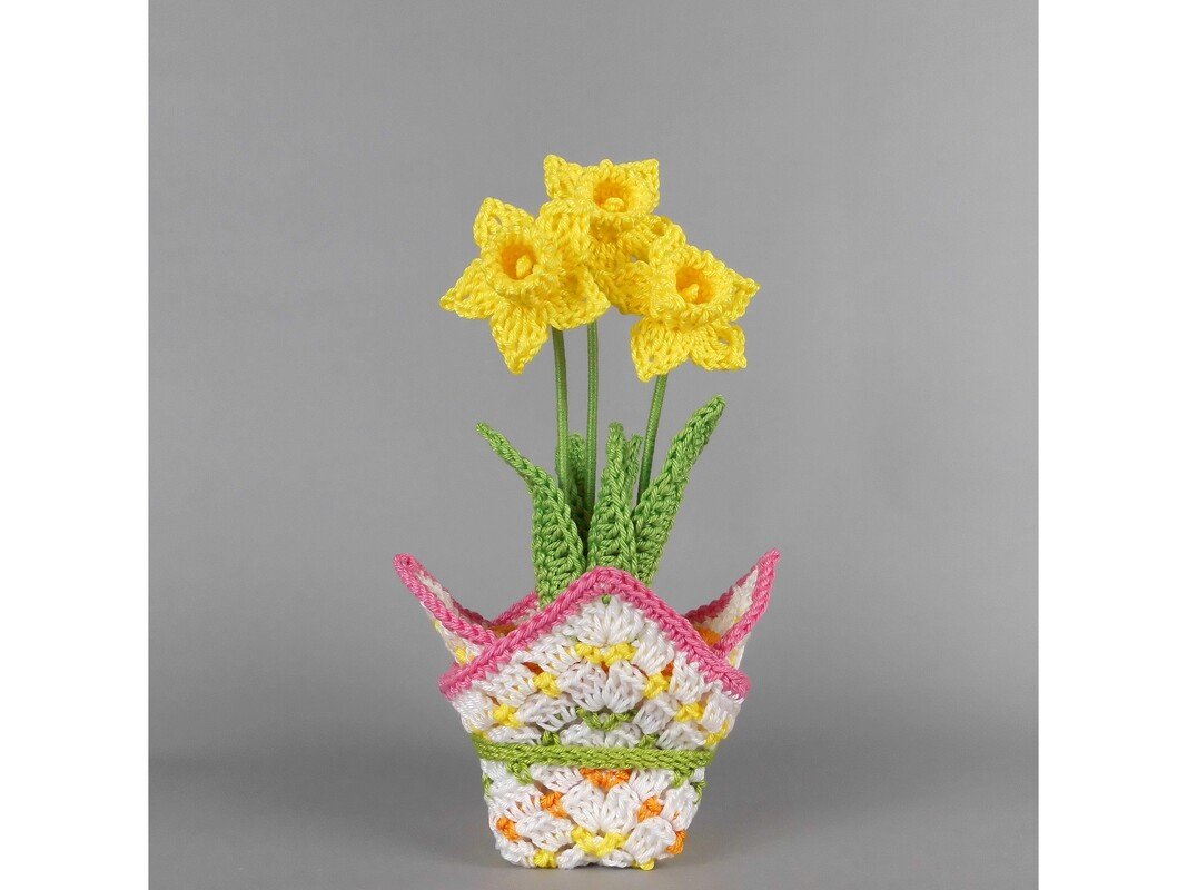 Diese kleinen Osterglocken (Narzissen) lassen sich schnell und unkompliziert aus Wollresten häkeln. Im niedlichen Blumentopf, ergänzt durch eine hübsche Manschette, werden sie zu einem liebevollen Geschenk für einen besonderen Menschen oder zu einem fröhlichen Blickfang auf Fensterbank, Tisch oder Regal.