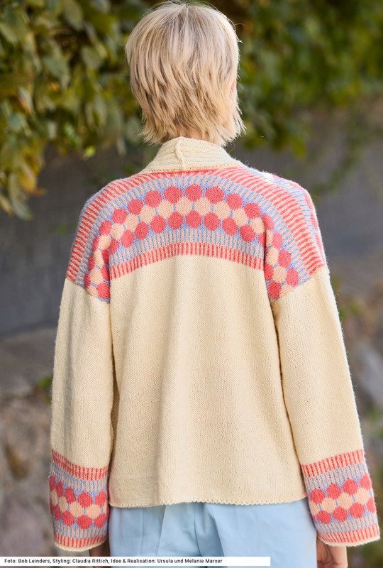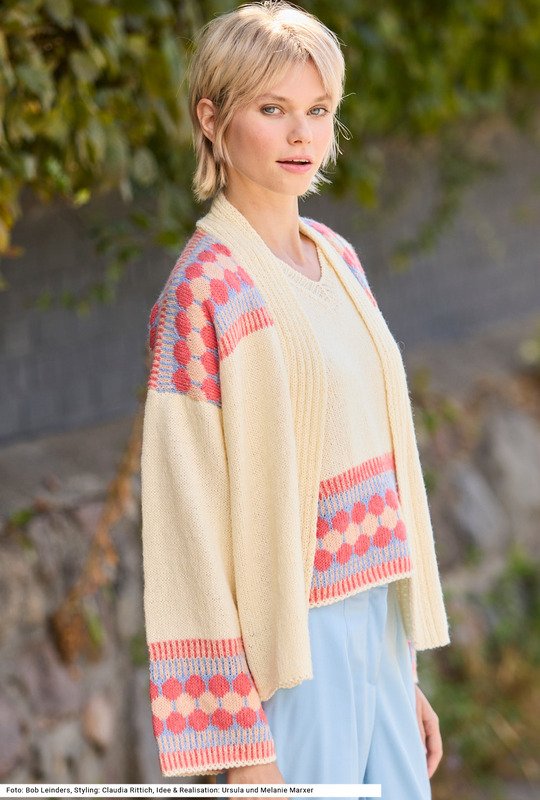Das Set aus Jacke und Kurzarmpulli begeistert mit einem raffinierten grafischen Jacquardmuster. Bei der Jacke ziert es den oberen Schulterbereich und die unteren Ärmelränder, beim Pulli nur den unteren Bundbereich – zusammen getragen, entsteht so ein außergewöhnliches Musterbild. Alle anderen Bereiche sind schlicht unifarben glatt rechts gestrickt. Die verschlusslose Jacke hat einen Schalkragen aus 2/2-Rippen, das Rippenmuster an den Ärmelbündchen und an der V-Ausschnittblende wird im 1/1-Rippenmuster gearbeitet. Die Anleitung für ein Garn aus Baumwolle, Schurwolle und Alpaka steht für die Größen 38/40, 44/46 und 52/54 bereit.