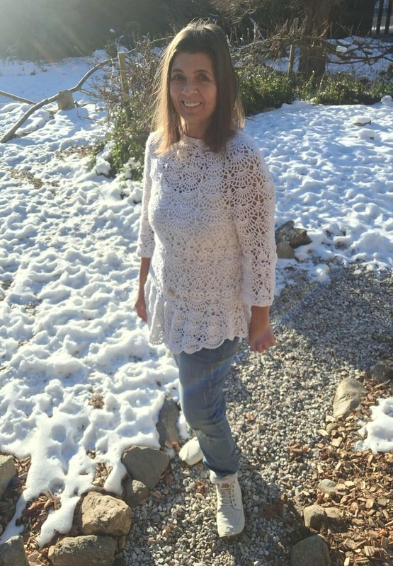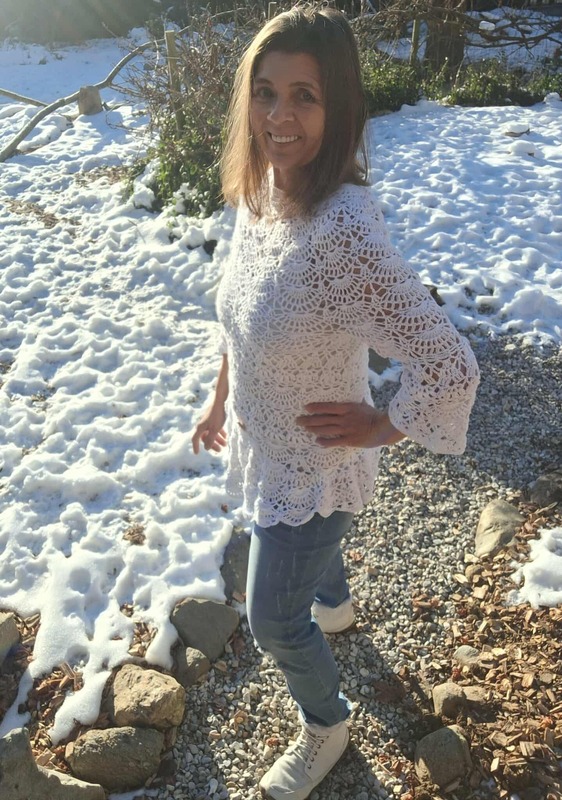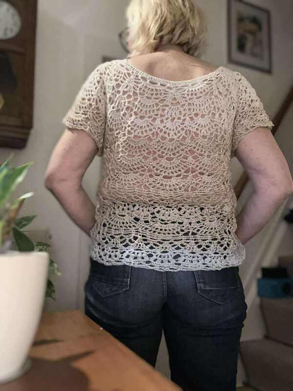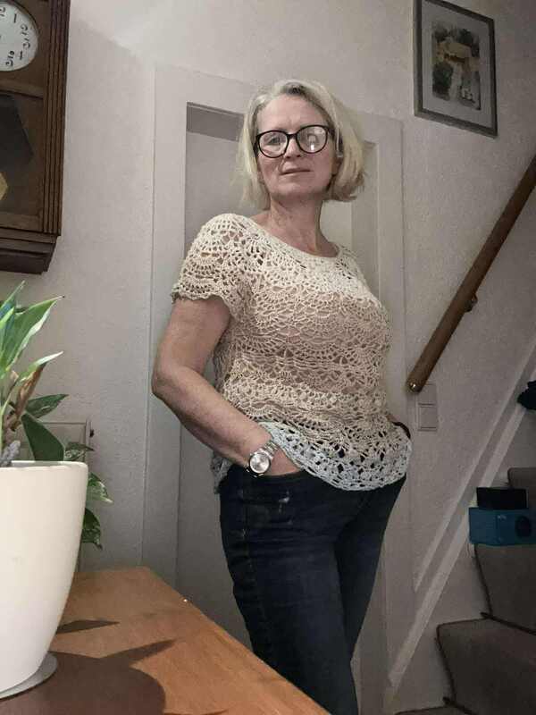 Willow wird in einem Stück von oben nach unten gearbeitet, für den schrägen Abschluß muss 1 x neu angesetzt werden, die Ärmel werden direkt angehäkelt.