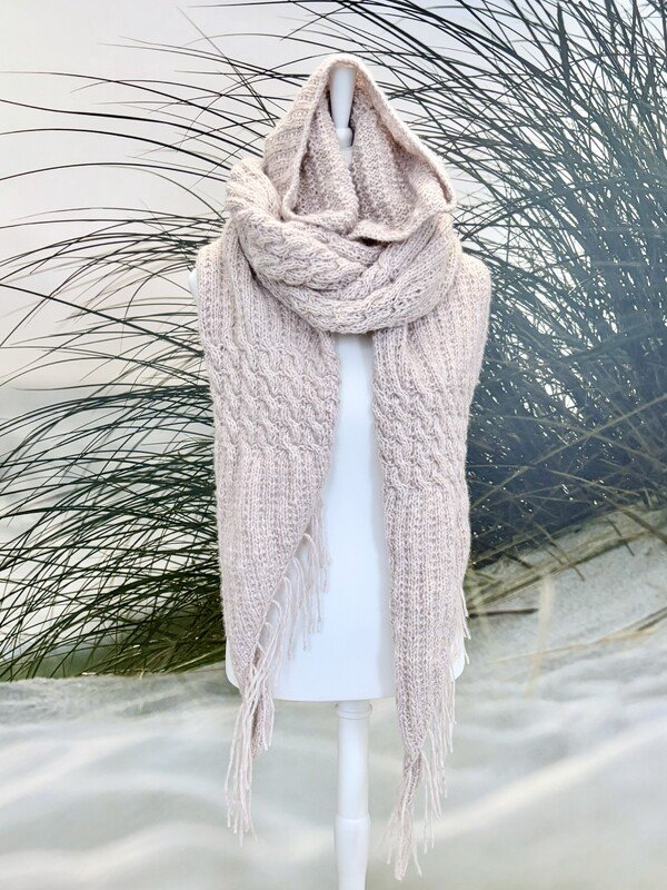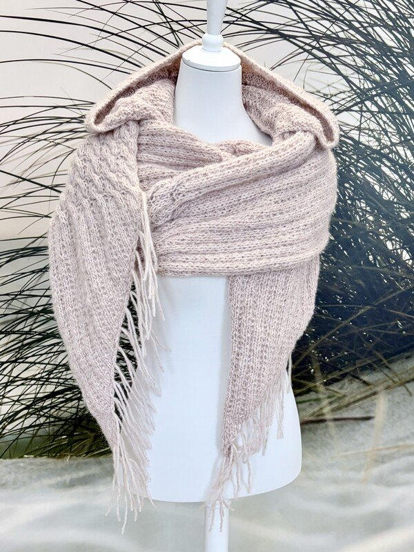 Kuschliger Schal mit Kapuze, gestrickt in Streifen- und Zopfmuster. Der Schal ist ungefähr 250 cm lang, Breite und Länge können beliebig angepasst werden. Die Anleitung enthält Fotos, Text, Tipps und die detaillierte Musterbeschreibung.