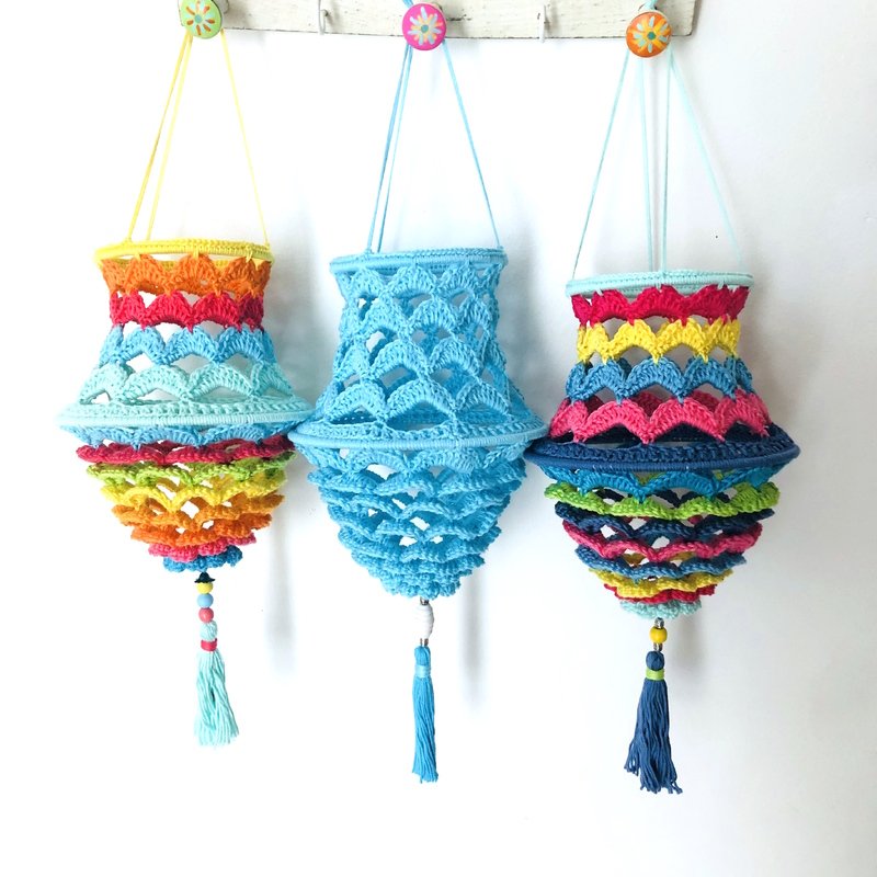 Man kann diese Lampions einfarbig oder ganz bunt häkeln. Die Häkelanleitung enthält genaue Angaben für beide Versionen, da sich deren Herstellung leicht unterscheidet.