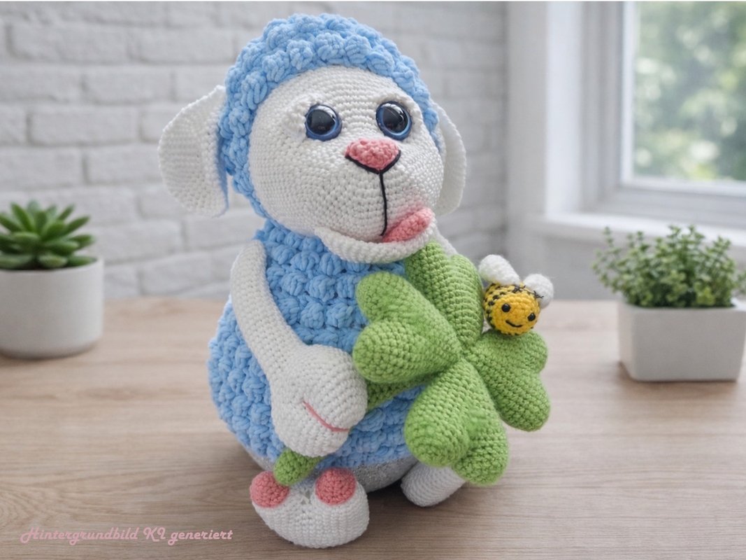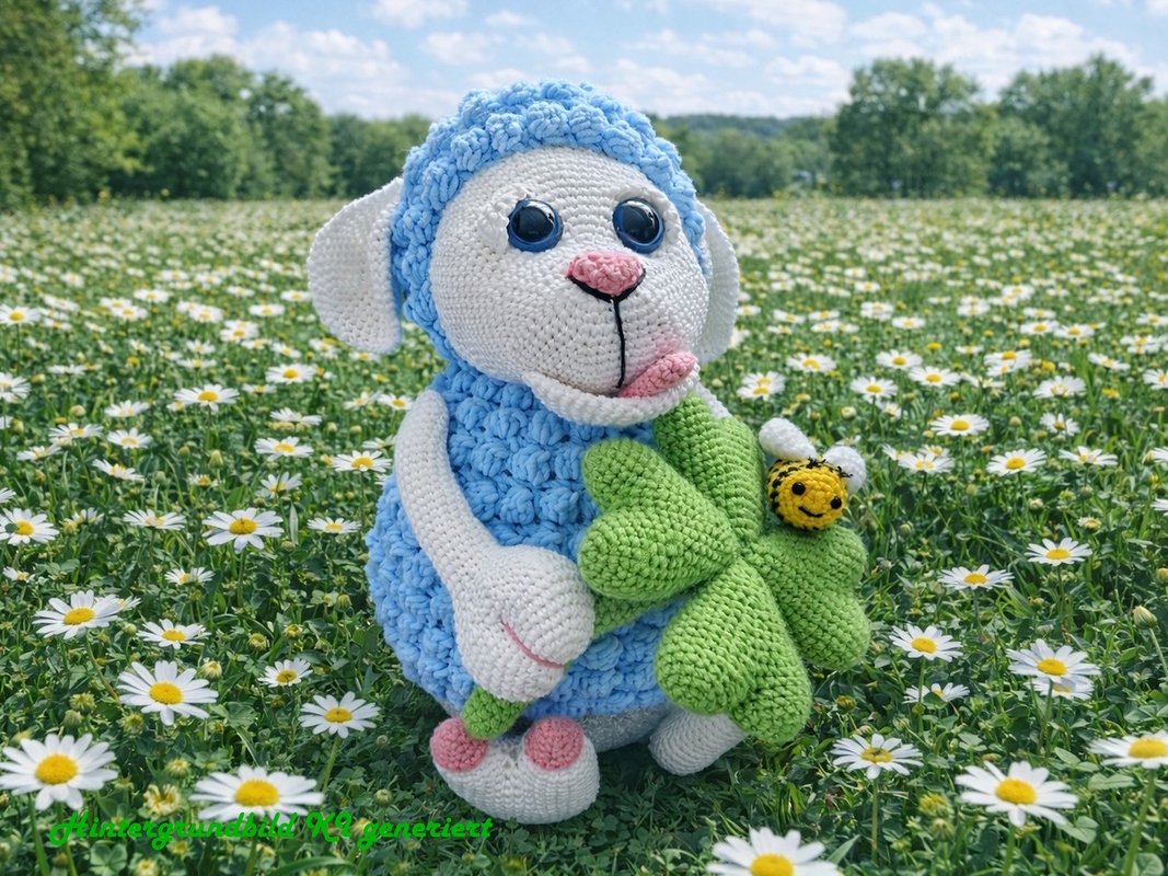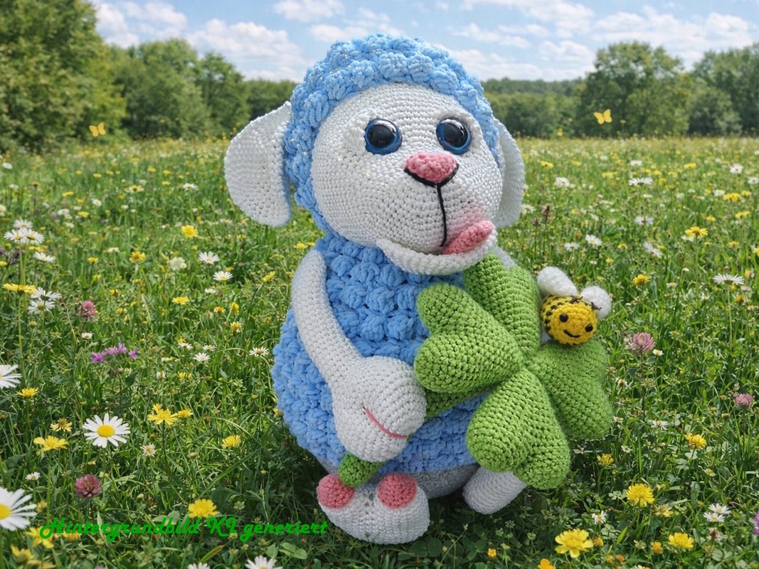 (Die Figur ist komplett handgehäkelt. Der Hintergrund ist mit Hilfe einer KI erstellt.)
