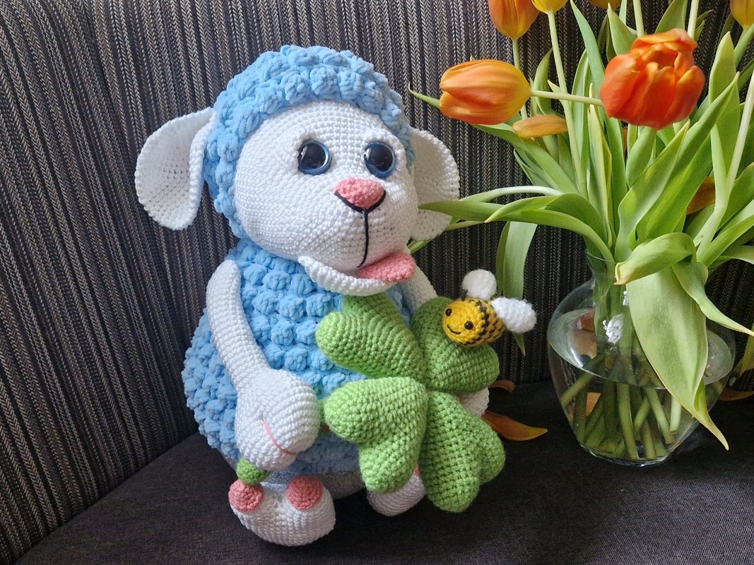 Nach Fertigstellung wird Schäfchen Mateo ca. 38 cm groß (bei Verwendung der angegebenen Nadelgröße und Wollstärke).