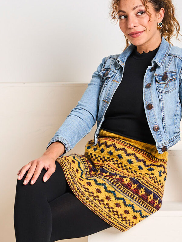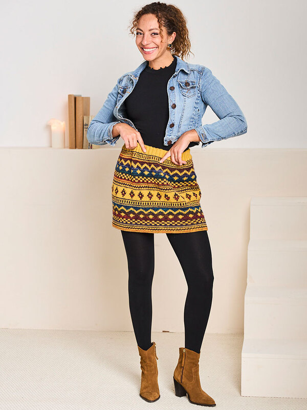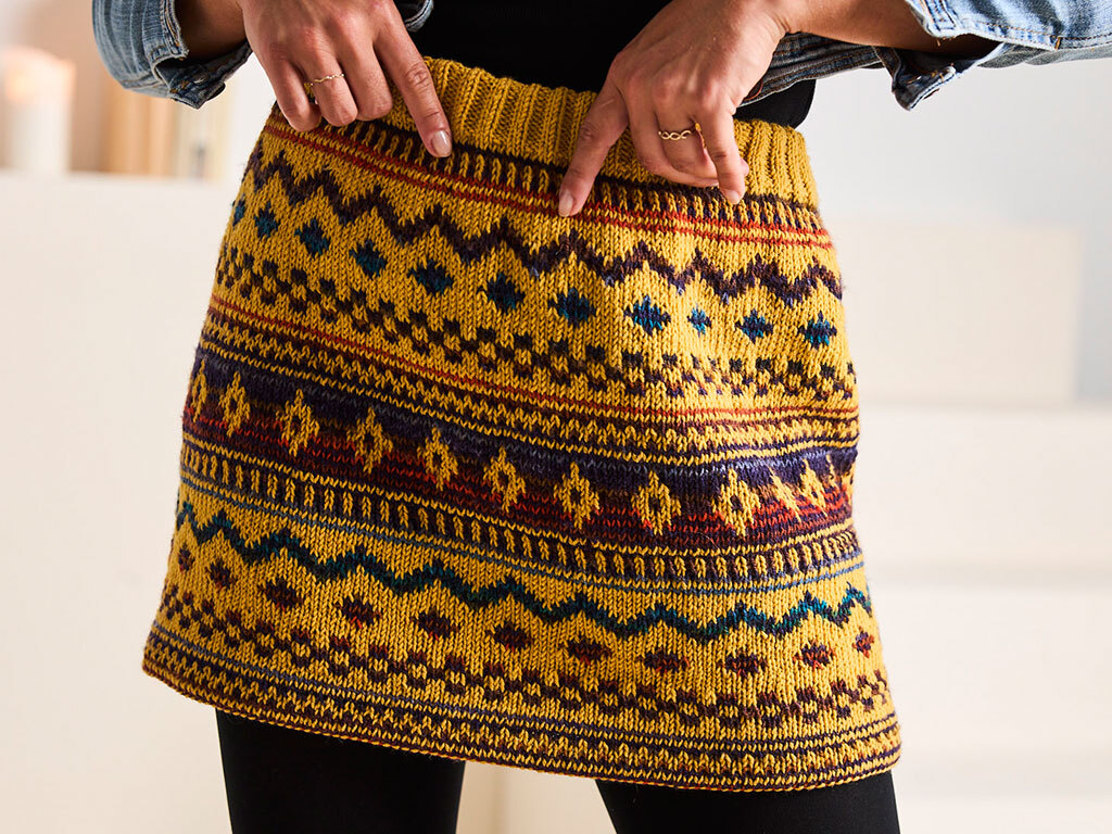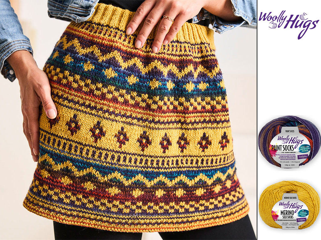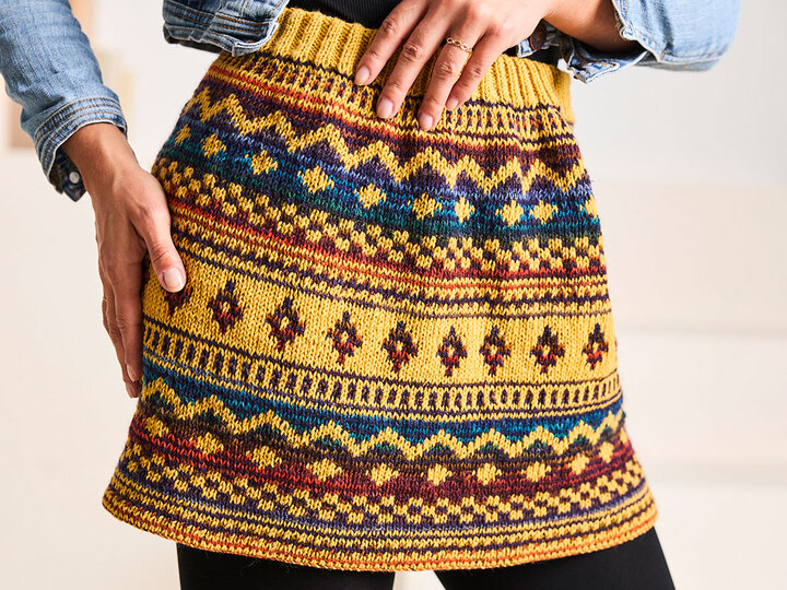 Von warmem Gold über tiefes Blau, sattes Rot bis hin zu royalem Lila – die Farben tanzen förmlich über den Rock und zaubern dieses wunderschöne, grafische Norwegermuster, ohne dass ich kompliziert Farben wechseln oder lange Fäden verketteln musste. Einfach stricken, Farbe wirken lassen und sich freuen!