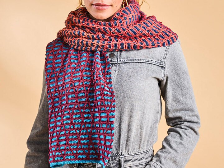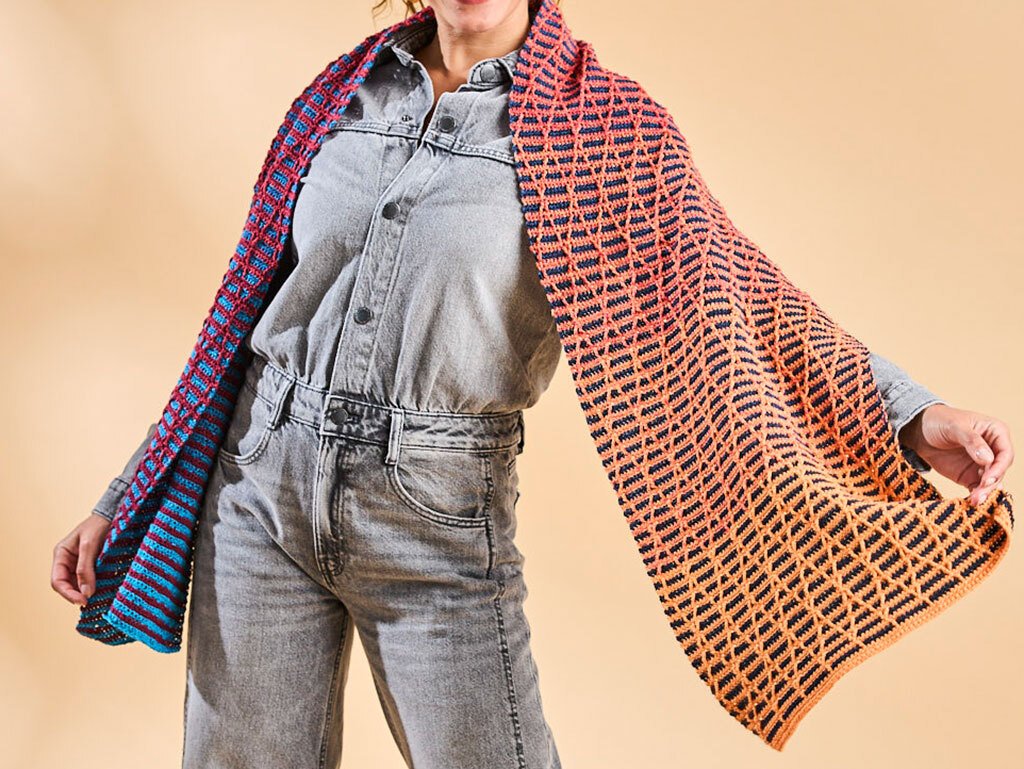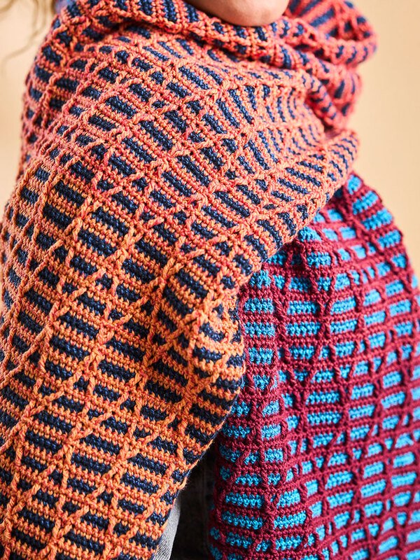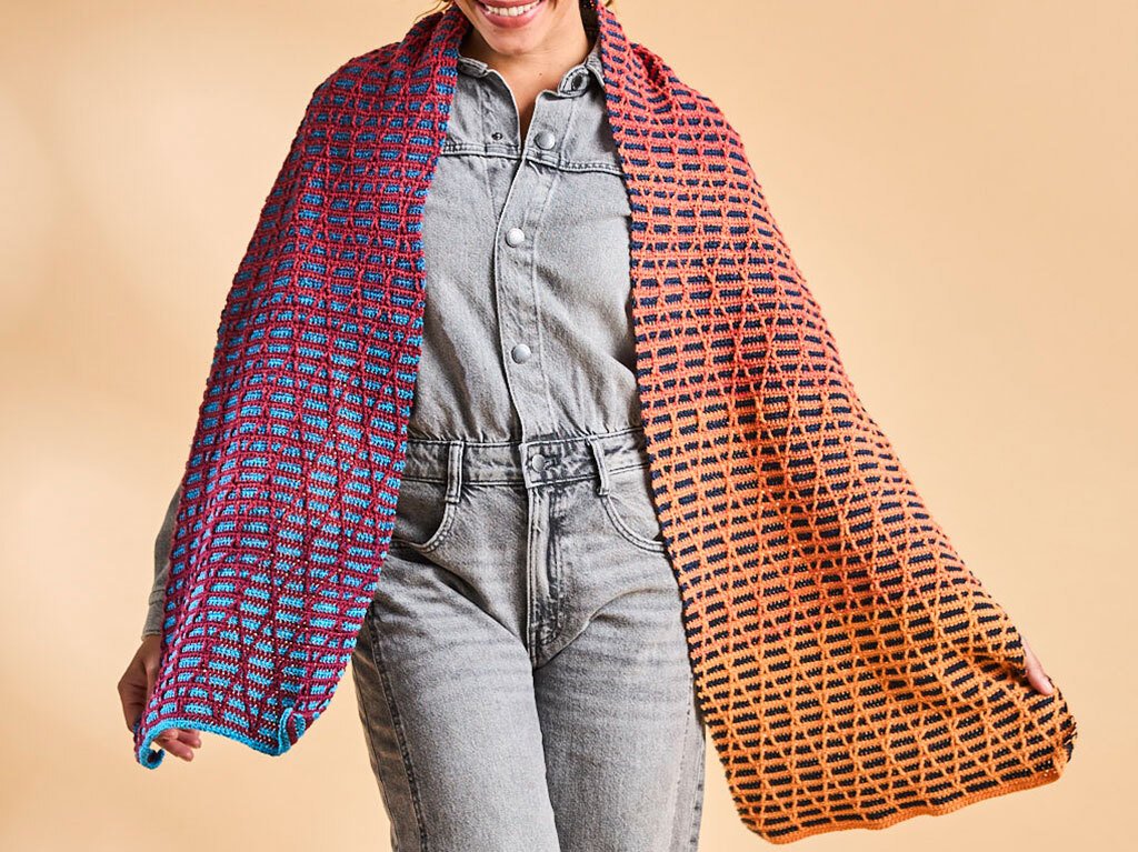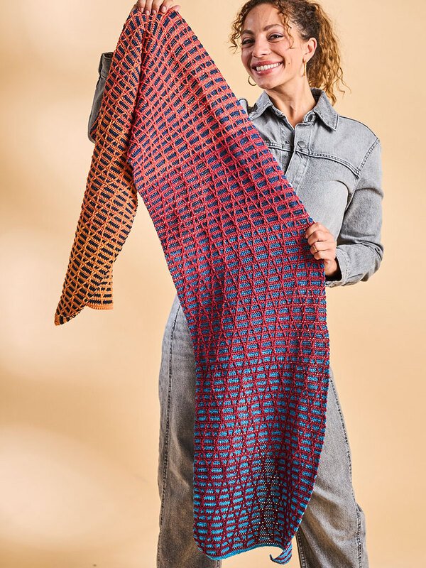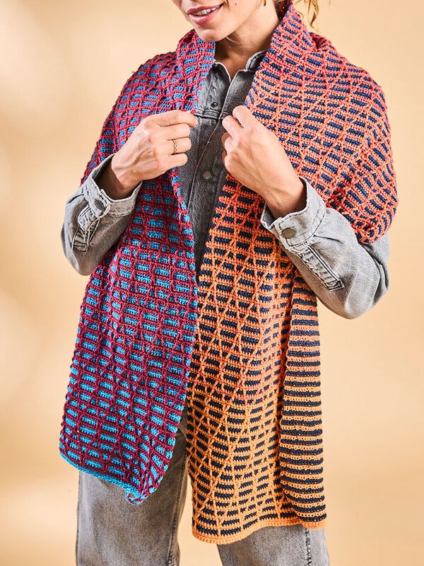 Mit nur 2 Bobbeln entsteht dieses luftige Rautenmuster-Tuch – ein echtes Farbfeuerwerk aus Orange, Koralle, Petrol und Tiefblau. Leicht, elegant und perfekt für jede Jahreszeit. Einfach häkeln, umhängen, verlieben. Dein neuer Lieblingsschal wartet schon!