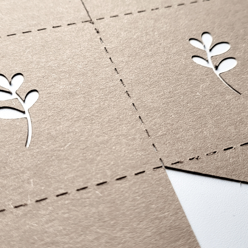 Du bekommst dabei zwei Versionen: Eine mit Falzlinien für Schneidplotter mit Scoring Wheel (Falzwerkzeug) und eine Variante, in der ich die Falzlinien in perforierte Schnitte umgewandelt habe. So kannst du die Box ganz einfach ohne Werkzeug zusammensetzen, sobald du sie geschnitten hast (siehe Foto 3).