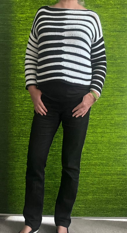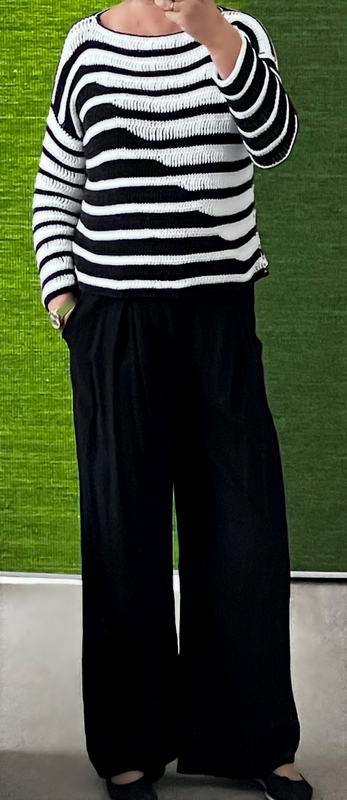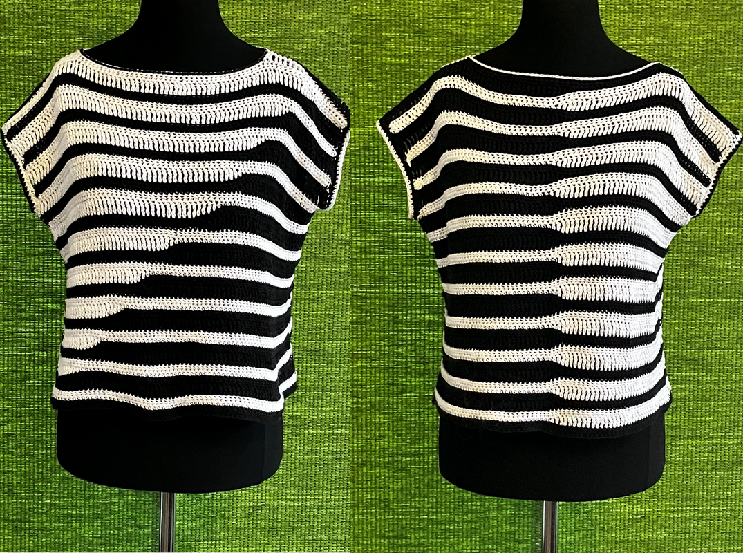 Mit dieser einfachen Häkeltechnik kannst du verschiedene Ansichten zaubern: Ob der Farbwechsel senkrecht, schräg oder waagerecht verläuft, entscheidest du. Gerne auch Vorderteil und Rückenteil verschieden. Du kannst alle Modelle mit oder ohne Ärmel häkeln. Lang oder kurz, breit oder schmal. Für alle denkbaren Größen -auch für Kinder, mit allen Garnen für Winter oder Sommer. Auch andere Farben als der Klassiker schwarz-weiß sind natürlich möglich. Übrigens: Streifen machen schlank