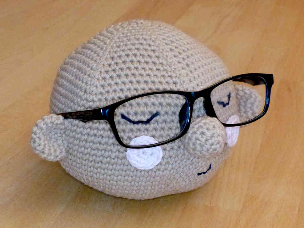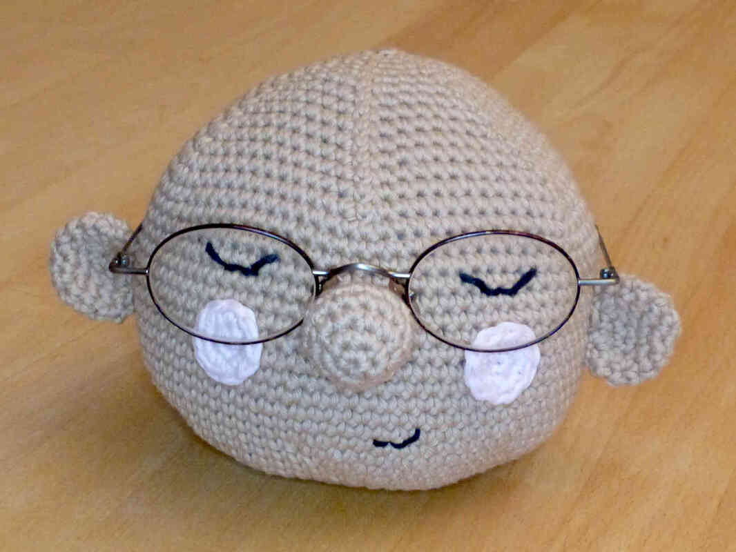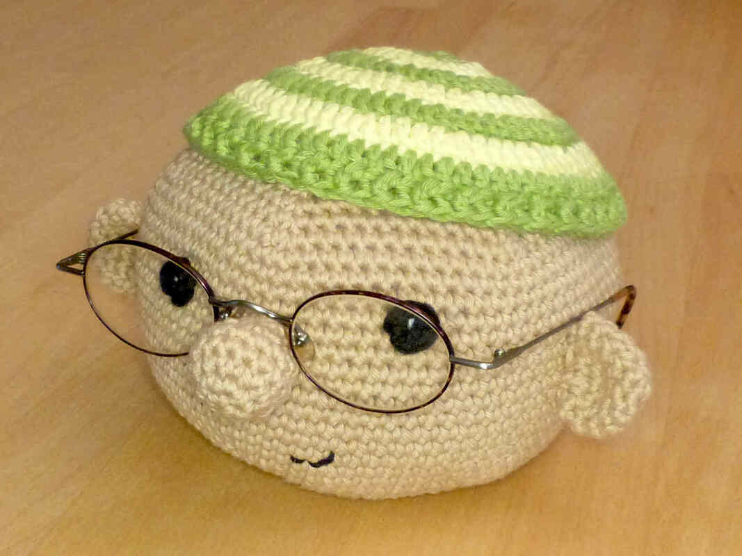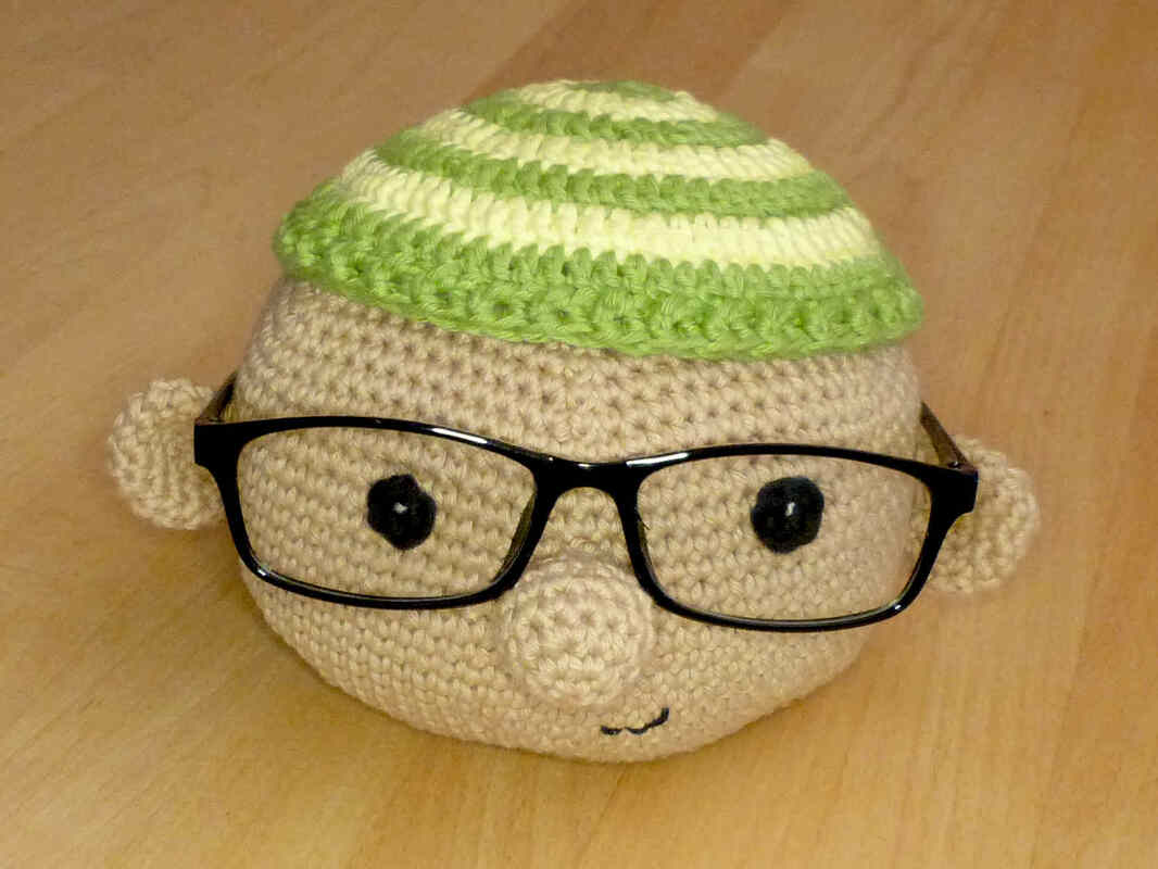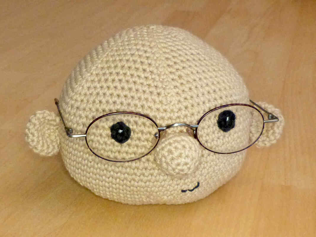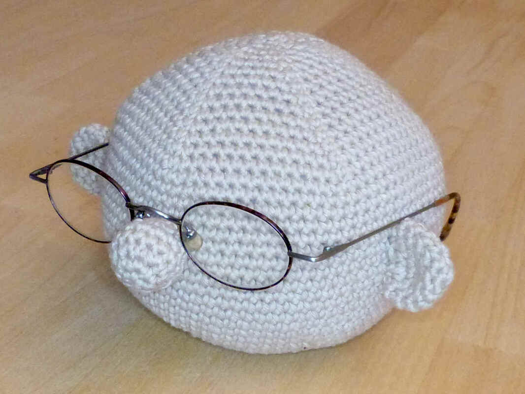 Bei Verwendung von Baumwollgarn mit einer Lauflänge von ca. 85m/50g und Nadelstärke 3,5 wird der Kopf ca. 14 cm breit (ohne Ohren gemessen) und passt für viele handelsübliche Brillen.