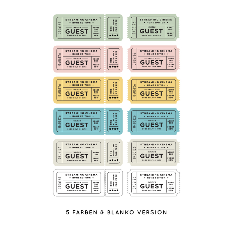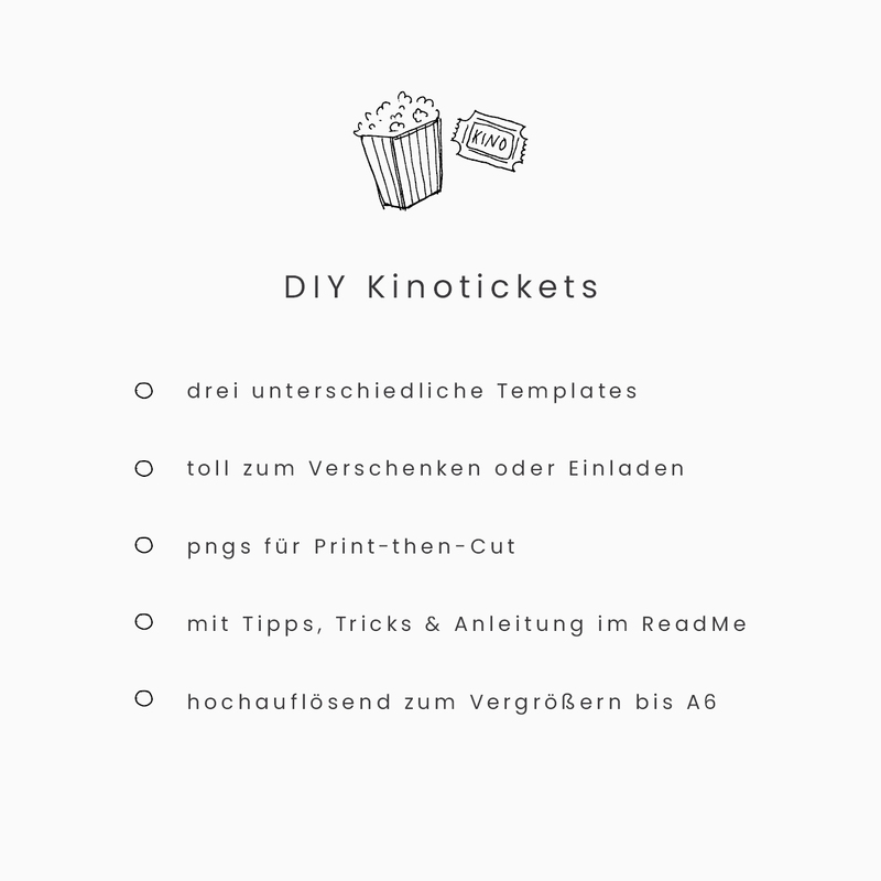 Dann kannst du mit meinen „Print then Cut“ pngs kleine Tickets selberdrucken und direkt plotten. Damit kann das „Streaming Cinema“ öffnen und deine Gäste haben einen Platz in der ersten Reihe reserviert. Das Motiv gibt es in 3 unterschiedlichen Ausführungen: