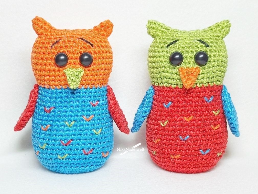 Mit der angegebenen Wolle wird der Schlüsselanhänger Glückseule etwa 6,5 cm groß, die etwas größere Glückseule etwa 11 cm groß.