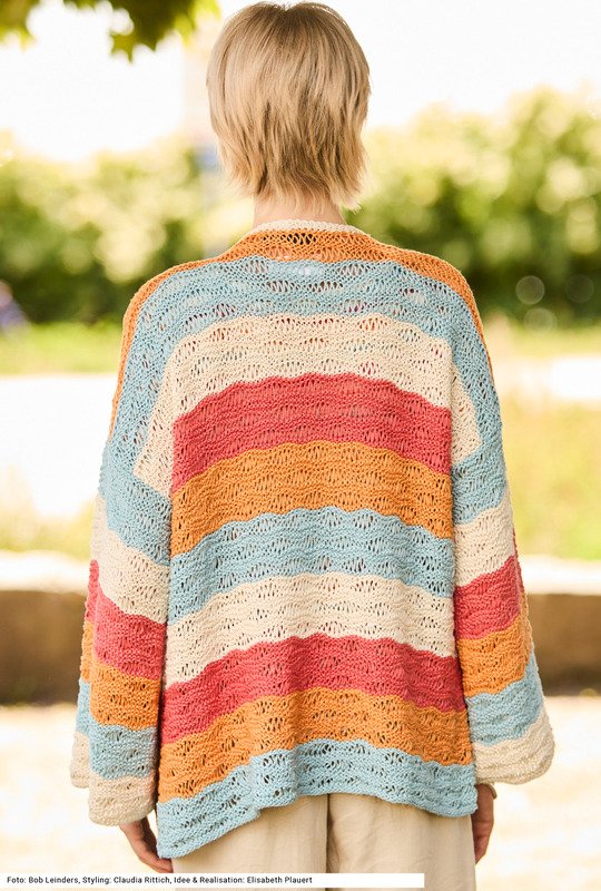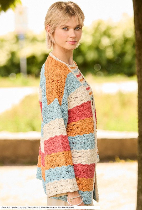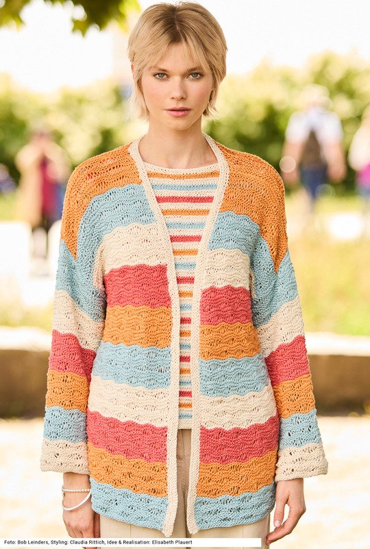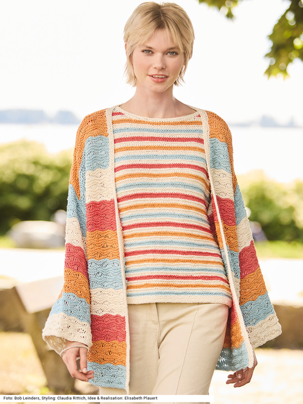 Das Twinset bringt mit Blockstreifen an der Jacke und feinen Ringeln am kurzärmeligen Pulli Sommerflair in die Garderobe. Gestrickt werden beide mit einem leichten Baumwolle-Kaschmir-Mischgarn, das weich fällt und einen dezenten Glanz zeigt. Die Jacke punktet mit Wellenmuster, während der Pulli mit glatt rechts und kraus rechts schmale Streifen hat. Die Kanten an beiden Teilen sind kraus rechts gearbeitet. Der Pulli ist figurbetont tailliert, die Jacke ganz gerade. Eine Anleitung steht für die Größen 36/38, 40/42 und 44/46 zur Verfügung.