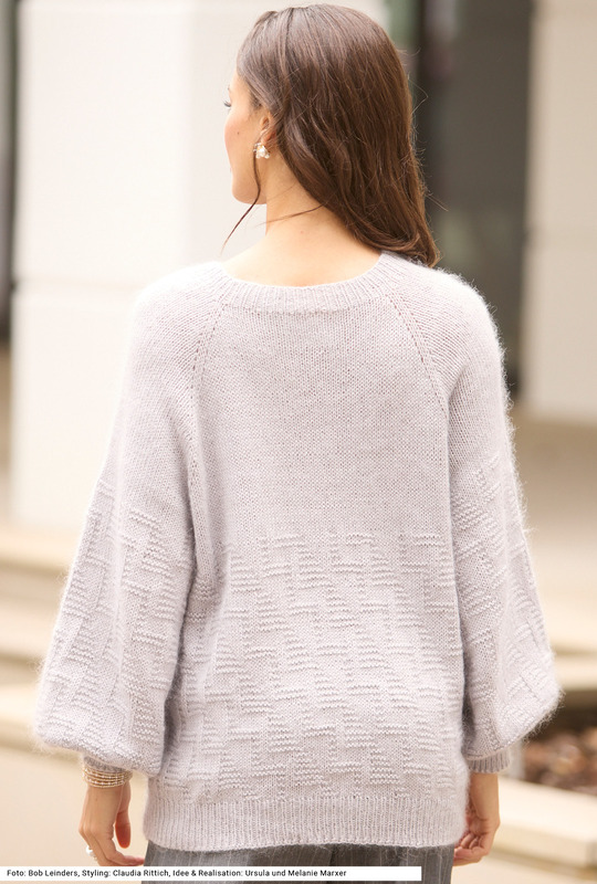 Dieser Raglanpullover fühlt sich dank der beiden Garne, einmal Baumwolle und einmal Mohair und Seide, besonders zart auf der Haut an. Das Modell wird zweifädig nahtlos von oben nach unten gestrickt. Ein lebendiges Strukturmuster aus rechten und linken Maschen sorgt für einen hübschen Kontrast zu den glatt rechts gestrickten Flächen. Bündchen und Halsausschnittblende sind im Rippenmuster gearbeitet. Weite Ärmel tragen zur Bequemlichkeit bei. Der flauschige Griff, die klare Form und das abwechslungsreiche Musterbild machen den Pulli zu einem echten Lieblingsstück. Eine Anleitung gibts für die Größen 38/40, 42/44 und 46/48.