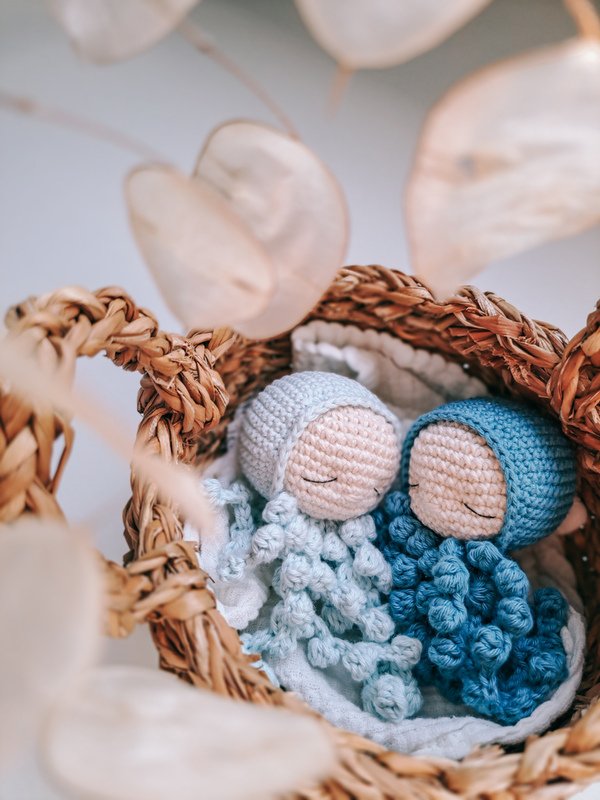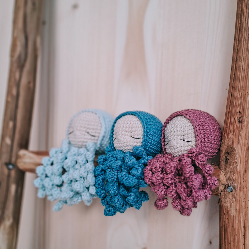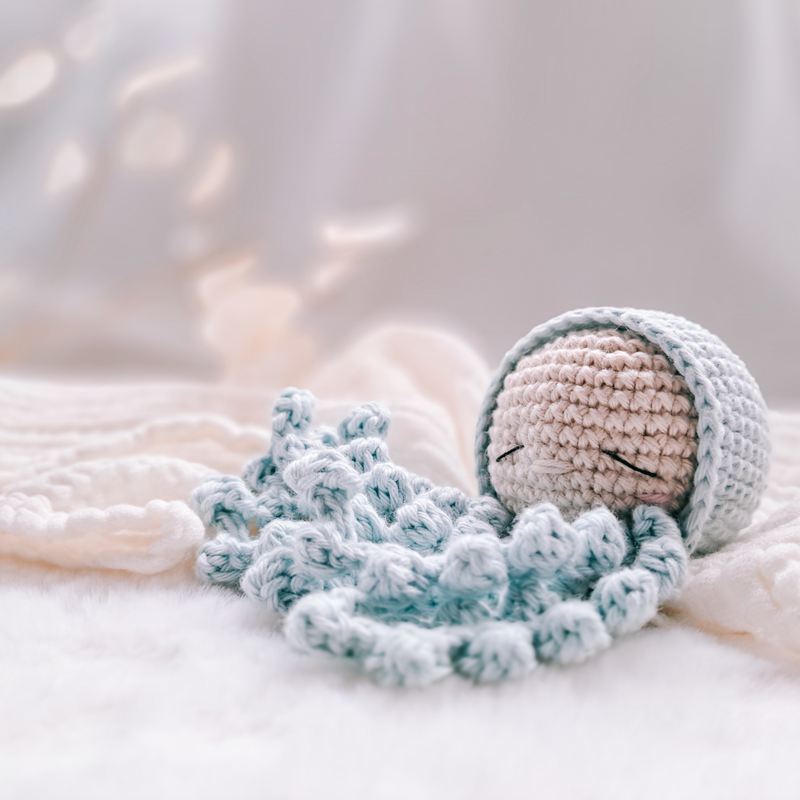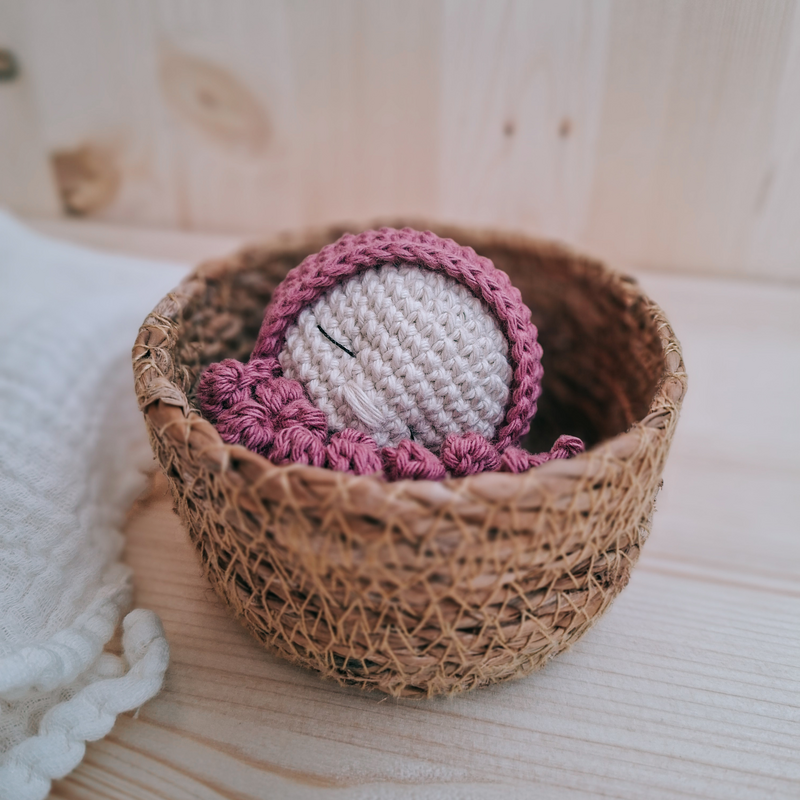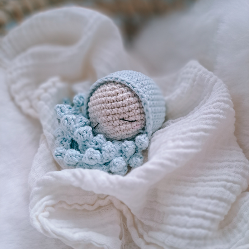Mit dieser Häkelanleitung häkelst du in strukturierten Schritten einen kleinen Oktopus für Frühchenn und Babys zur Geburt.