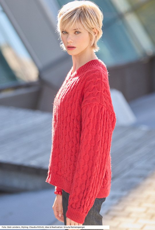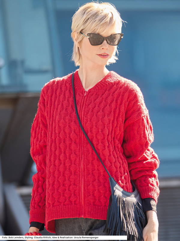 Diese blousonartig gearbeitete Jacke mit einem Reißverschluss, der an die gehäkelten Ränder genäht wird, ist ein echter Alltagsliebling. Das plastische Blasenmuster, entstehend aus über etlichen Reihen hochgezogenen Maschen, und der typische, zum Verschlussrand hin abfallende Blouson-Kragen setzen modische Akzente, während die bequeme Passform hohen Tragekomfort garantiert. Der Kragen wie auch die Bündchen werden im 1/1-Rippenmuster gestrickt. Zum Wohlfühlen trägt nicht zuletzt das Garn aus überwiegend Schurwolle mit Polyacryl-Anteil bei. Eine Anleitung kann für die Größen 40/42, 44/46 und 48/50 downgeloadet werden.