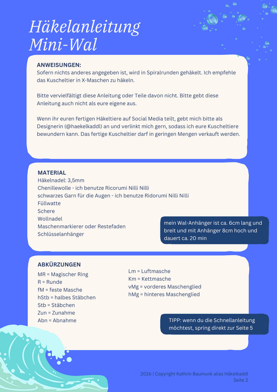Die Anleitung ist kompakt gehalten und so aufgebaut, dass du den Mini-Wal zügig nacharbeiten kannst – perfekt für kleine Häkelprojekte zwischendurch.
