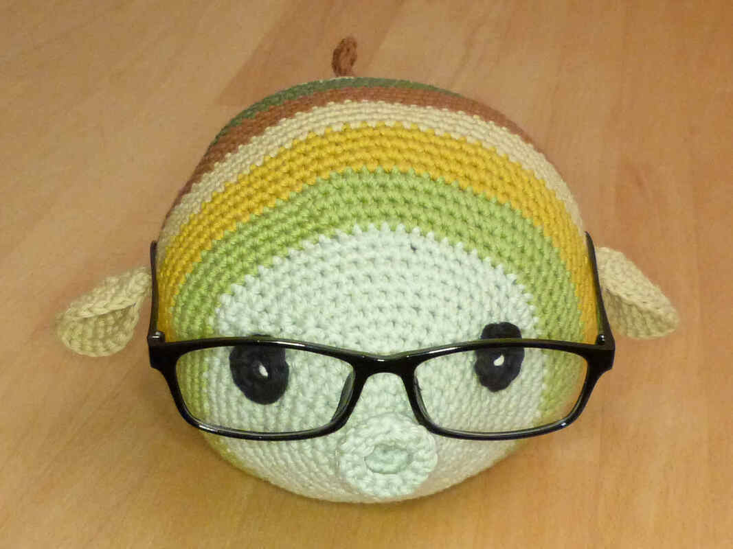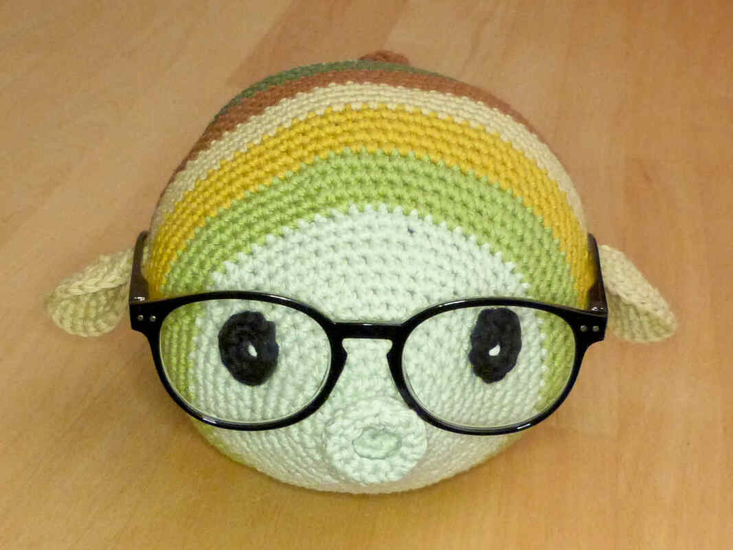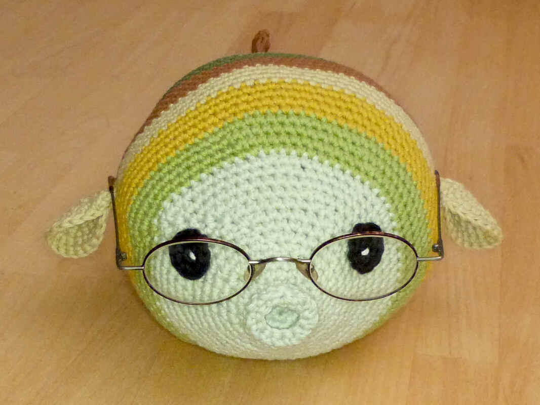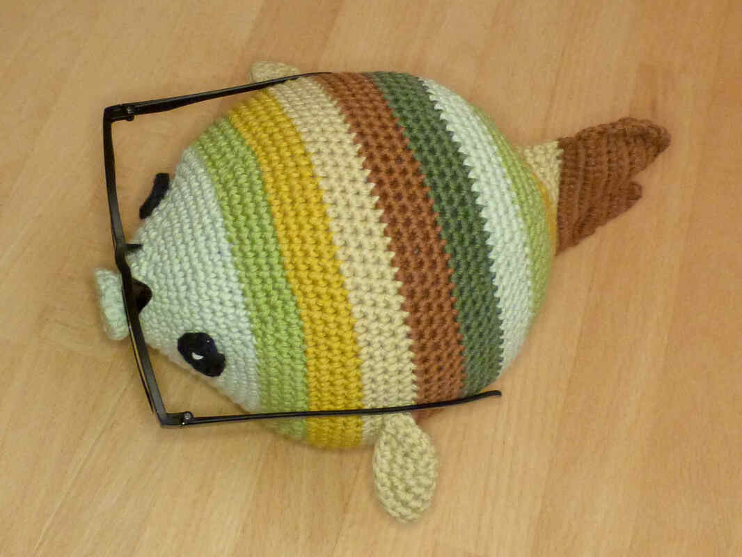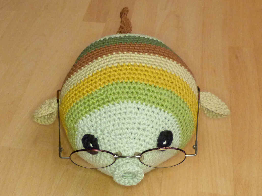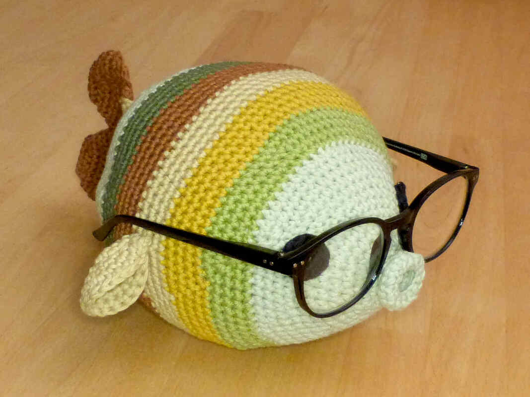 Bei Verwendung von Baumwollgarn mit einer Lauflänge von ca. 85m/50g und Nadelstärke 3,5 wird der Fisch ca. 23 cm lang und 15 cm breit (ohne Seitenflossen gemessen) und passt für viele handelsübliche Brillen.