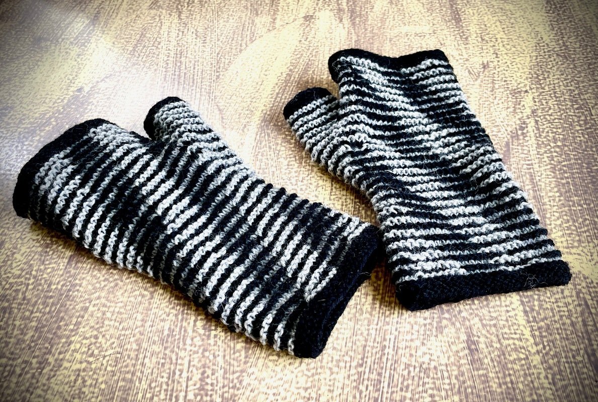 Je nach Strickstil reichen für die Armstulpen in der Regel sogar 25g Garn/Farbe. Du kannst also aus dem restlichen Garn sogar noch eine Mütze im passenden Muster stricken. Die Anleitung findest du ebenfalls auf dem Portal „Crazypatterns“, sie heisst: „Mütze Stripes Illusionsstricken“.